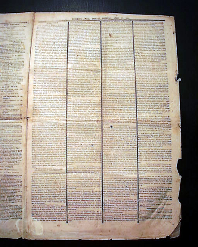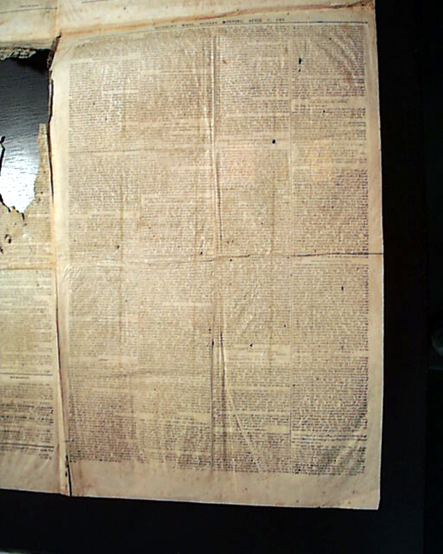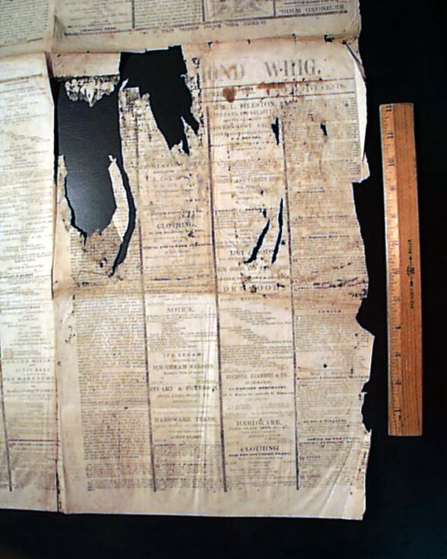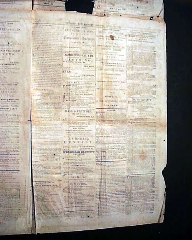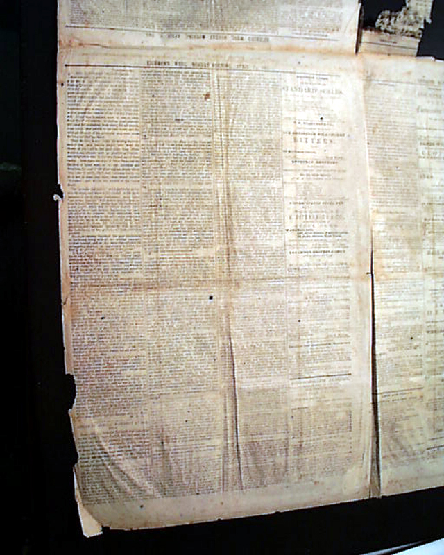 Eight pages, never bound nor trimmed. The front page of this issue is mostly damaged with various loss and staining, but fortunately the date is present (but part of the title is gone) and the first column did not contain any Lincoln-related content. Consequently page 2 is mostly damaged as well, but it contained mostly advertisements and notices. Curiously pages 3, 4, 5, 6, 7 & 8 escaped relatively unscathed and are in rather good condition save for some fold & margin wear, and this is where the Lincoln and war-related text is found (see).