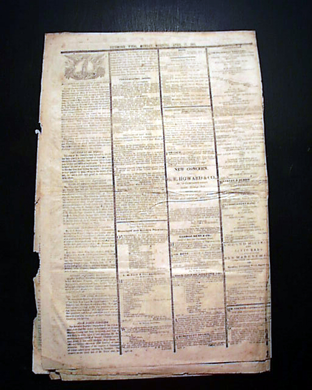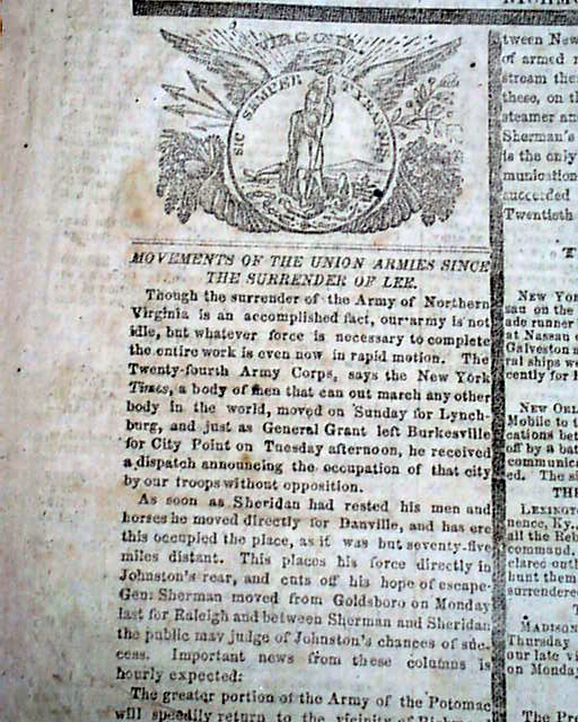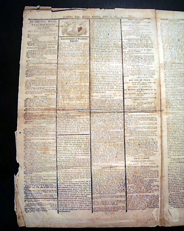Once the capital of the Confederacy fell to the North in early April the Yankees also took over the press and continued printing newspapers. This is an early issue of this "union occupation" newspaper with page 4 coverage of Lincoln's assassination. As noted in the Gilder Lehrman Institute of American History website, the Whig was the first newspaper in the South to print the news of the assassination. The report on page 4 is headed: "Assassination of President Lincoln!" The report begins: “The heaviest blow which has ever fallen upon the people of the south has descended! Abraham Lincoln, the President of the United States, has been assassinated. The decease of the Chief Magistrate of a nation at any period is an event which profoundly affects the public mind, but the time, manner and circumstances of President Lincoln’s death render it the most momentous, most appalling, most deplorable calamity which has ever befallen the people of the United States..." with much more (see).