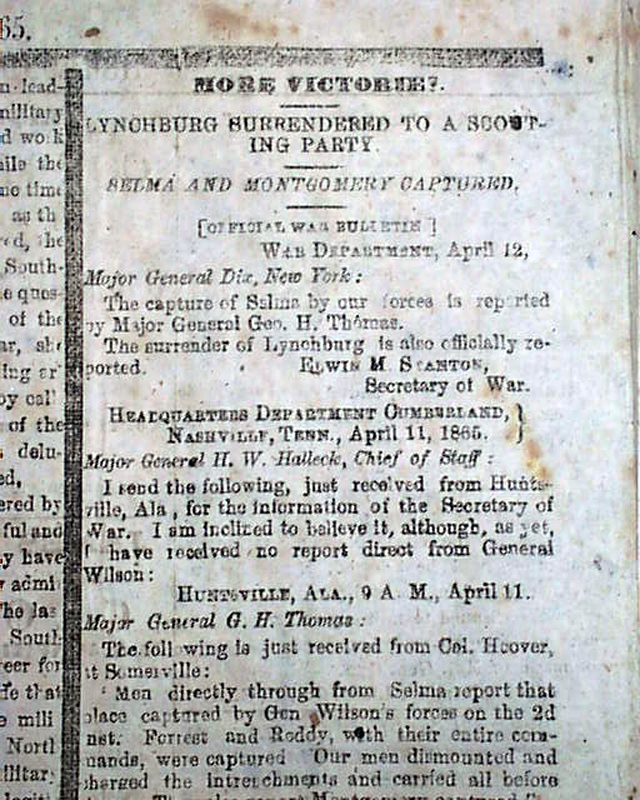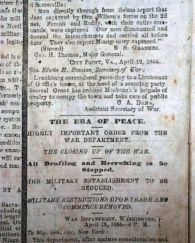Also on page 4 area heads: "More Victories" "Lynchburg Surrendered To A Scouting Party" "Selma and Montgomery Captured" "The Era Of Peace" "The Closing Up Of The War" "and more (see).