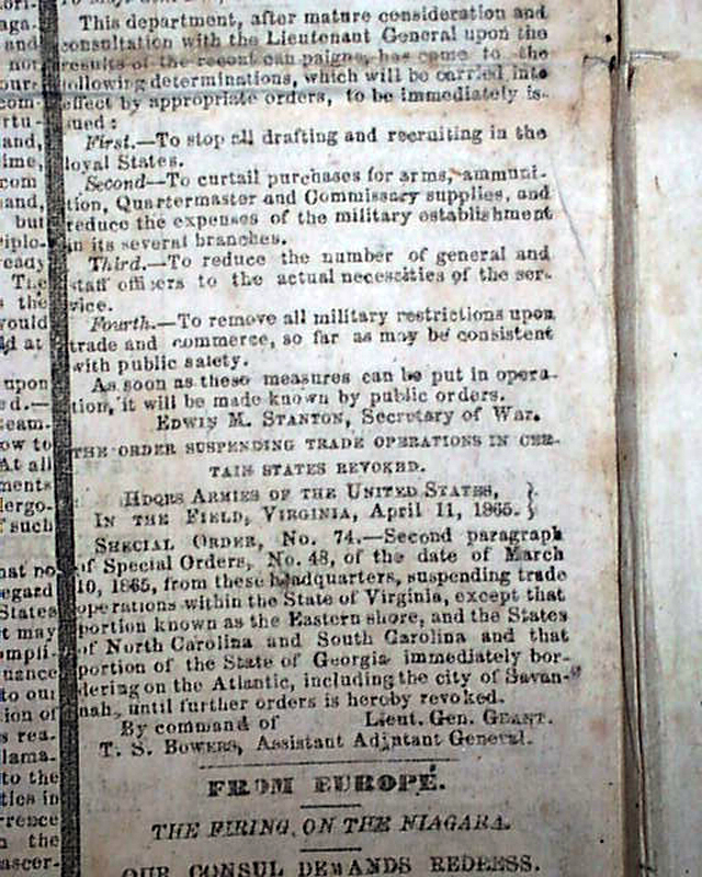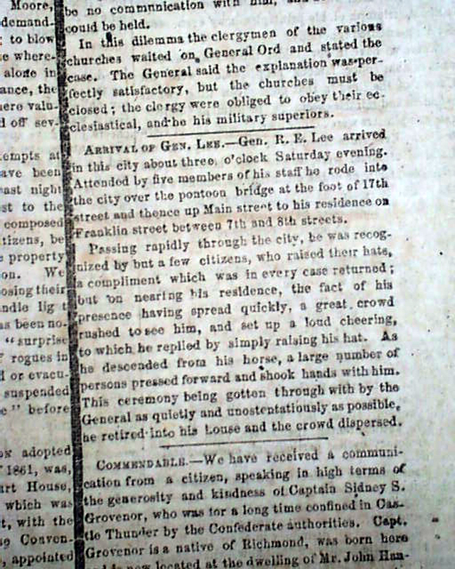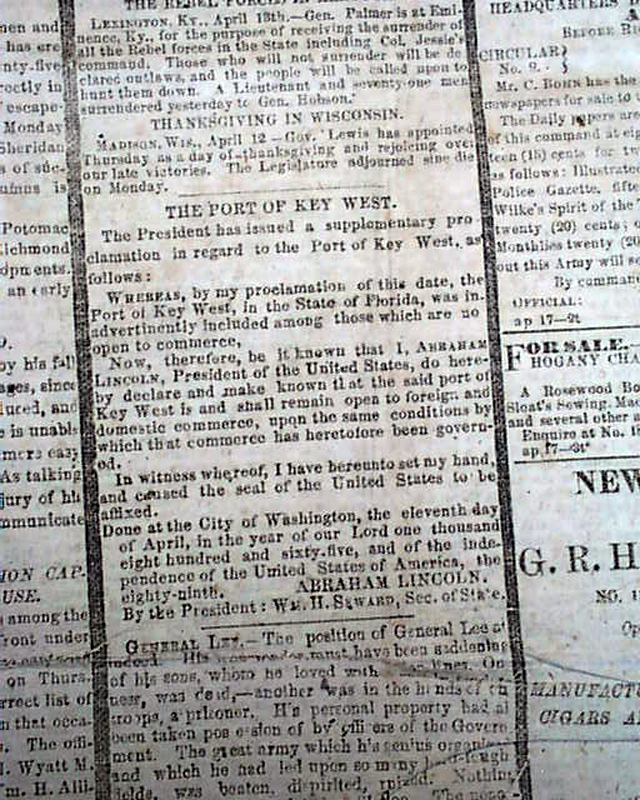 Page 5 has a report: "Arrival of Gen. Lee" noting: "Gen. R. E. Lee arrived in this city about 3 o'clock...Attended by 5 members of his staff he rode into the city...Passing rapidly through the city, he was recognized by but a few citizens who raised their hats, a compliment which was in every case returned..." with more (see). Pages 5, 6, 7 and 8 have much more concerning the concluding events of the Civil War. The back page has: "Movements Of The Union Armies Since The Surrender of Lee" and "Condition of Mr. Seward" "Captured Confederate Officers" and more, including an item: "General Lee" which begins: "The position of General Lee at the time of his surrender must have been saddening indeed..." with details (see). Just above it is a Proclamation signed in type by: Abraham Lincoln dated April 11, 1865.