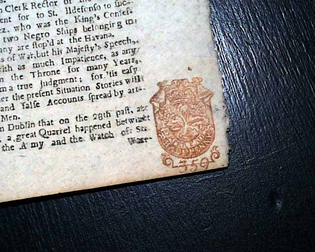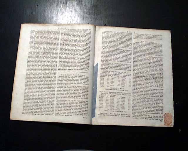 See the photo for one of the more beautiful, displayable mastheads of the 18th century, featuring two woodblock engravings, one showing two post boys on horseback trumpeting the news, and the other showing a winged angel trumpeting the news. Additionally, the first letter in the first column is within yet another very decorative engraving, all making the front page quite displayable.