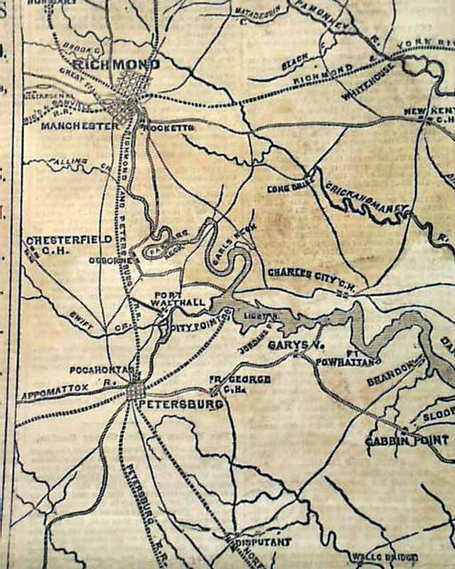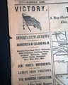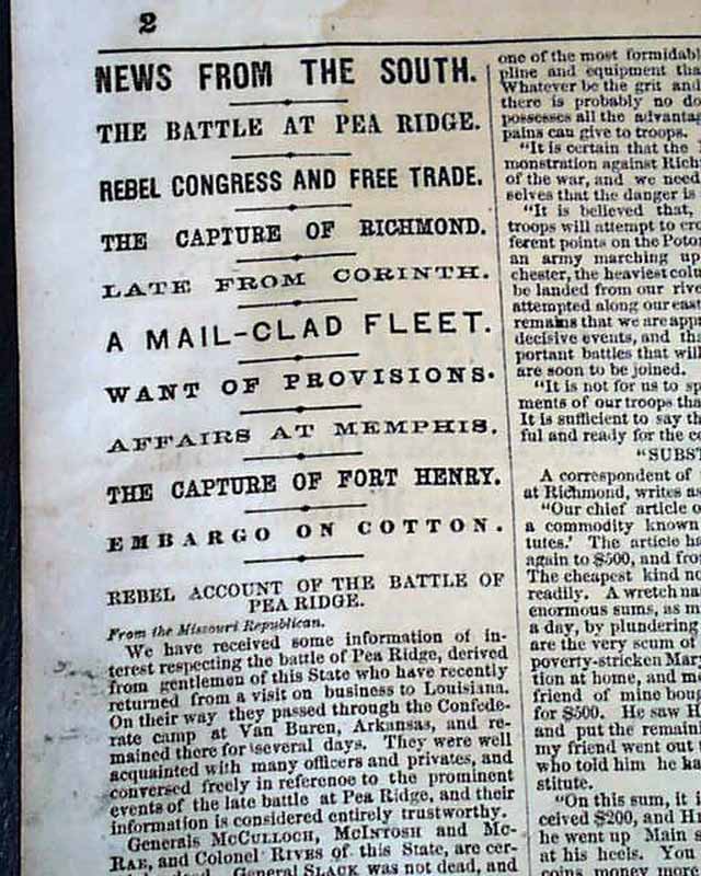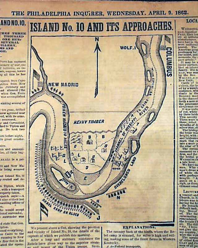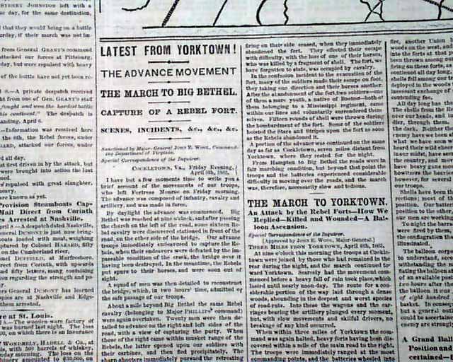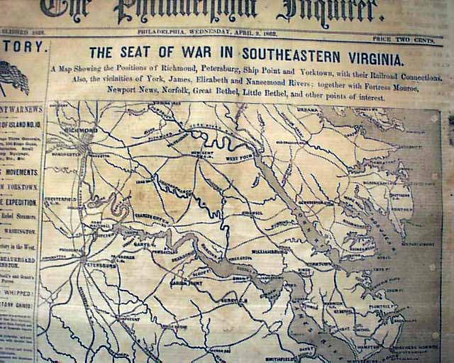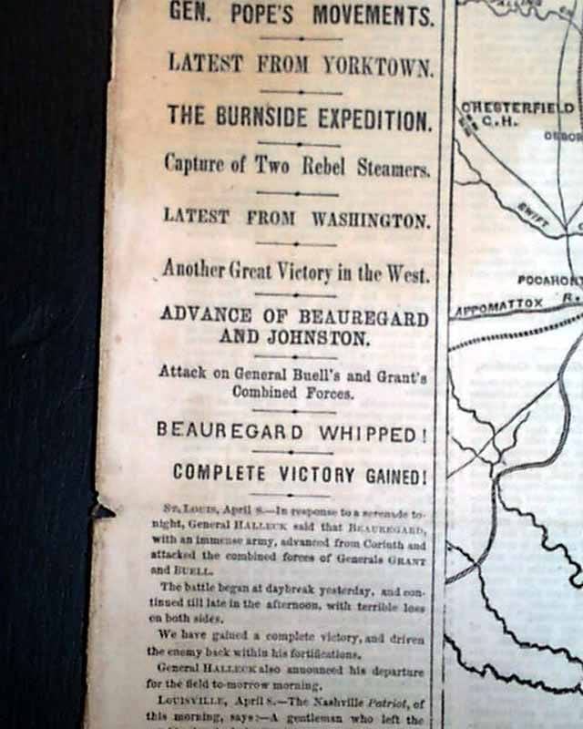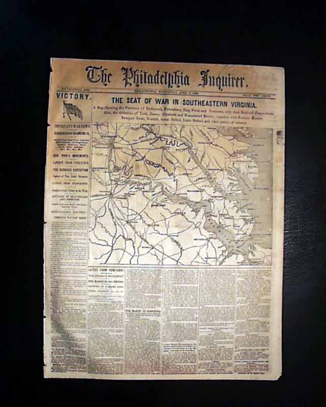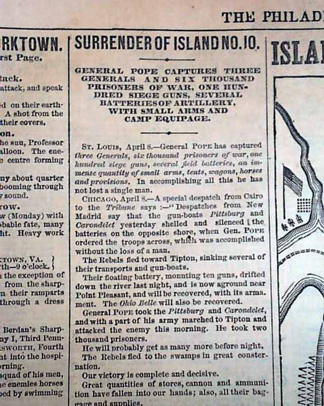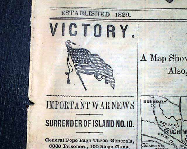 The front page id dominated by a very large Civil War map headed: "THE SEAT OF WAR IN SOUTHEASTERN VIRGINIA" with a lengthier subhead (see). Also nice first column heads on the Civil War wit a nice graphic of the U.S. flag headed with: "VICTORY". Other heads include: "Surrender Of Island No. 10" "Gen. Pope's Movement" 'Capture of Two Rebel Steamers" "Advance orf Beauregard & Johnston" "Beauregard Whipped!" and more.