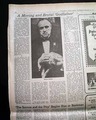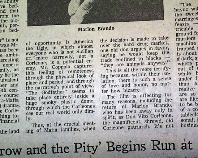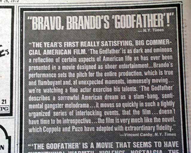 This newspaper has a significant & historic review and ad for the movie "The Godfather" on pages 56 & 57. This review is from the day after the movie made it's premiere making it a great addition for any movie memorabilia collection. Page 56 has a three column headline: "A Moving and Brutal 'Godfather'" with photo of Marlon Brando (see photos). I would have to say this is a very rare item as their was really no reason for anyone to keep this issue at the time.
