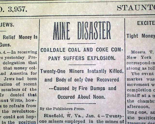 The front page has one column headlines that include: "MINE DISASTER", "Coaldale Coal And Coke Company Suffers Explosion" and more. This is 1st report coverage on the Coaldale coal & coke company mining disaster. Other news of the day. Complete in 8 pages, light browning, minor margin wear, otherwise good. Should be handled with care.