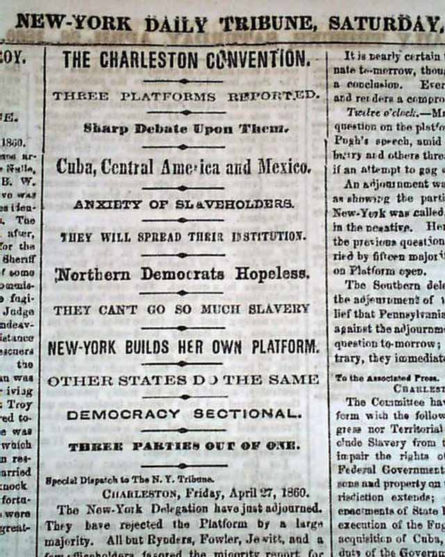 NEW YORK TRIBUNE, April 28, 1860 Among column heads on page 7 are: "Anxiety Of Slaveholders" "They Will Spread Their Institution" "Northern Democrats Hopeless" "They Can't Go So Much Slavery" and more.