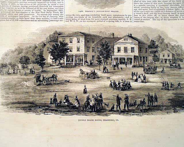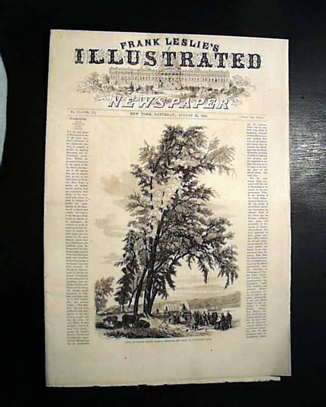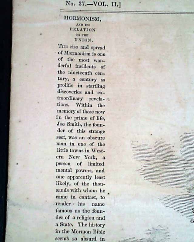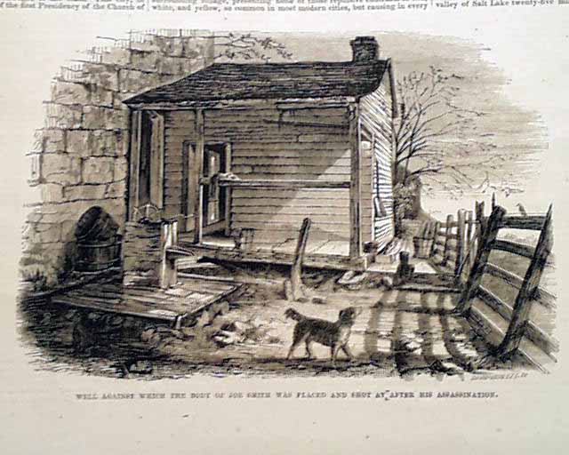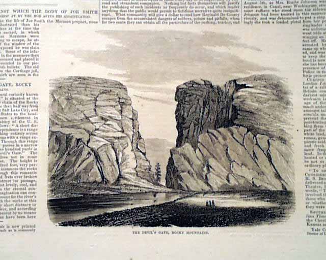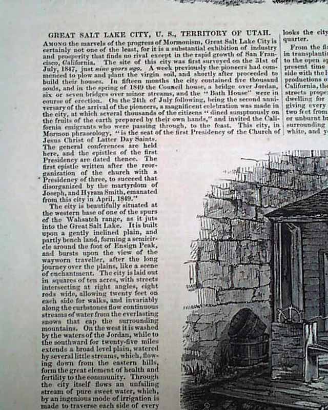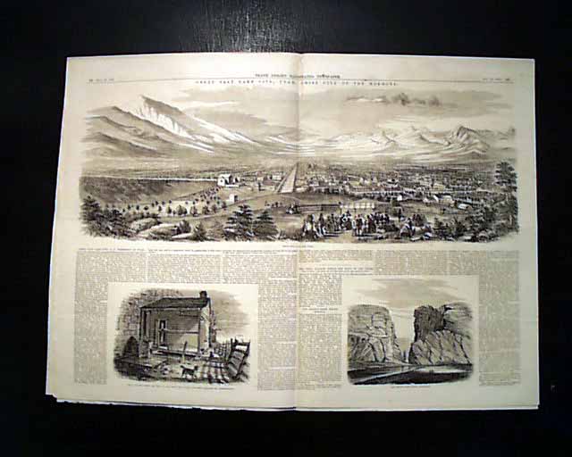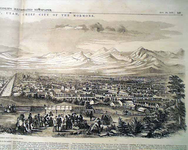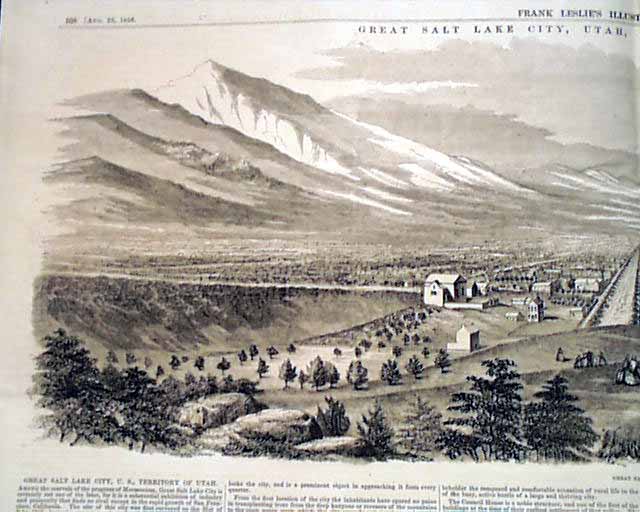 FRANK LESLIE'S ILLUSTRATED, New York, Aug. 23, 1856 The front page has a print: "Ferry at Council Bluffs--Mormon Emigrants and Group of Cottonwood Trees" with the balance of the front page (and a bit of pg. 2) taken up with an article: "Mormonism, and the Relation to the Union". Relating to this is a great doublepage illustration headed: "Great Salt Lake City, Utah, Chief city of the Mormons" which is a terrific & panoramic view of Salt Lake City (see). Also on this centerfold are smaller prints; "Well Against Which the Body of Joe Smith was Placed & Shot at After His Assassination" and "The Devil's Gate, Rocky Mountains". There are related articles for each of these 3 Mormon-related prints.