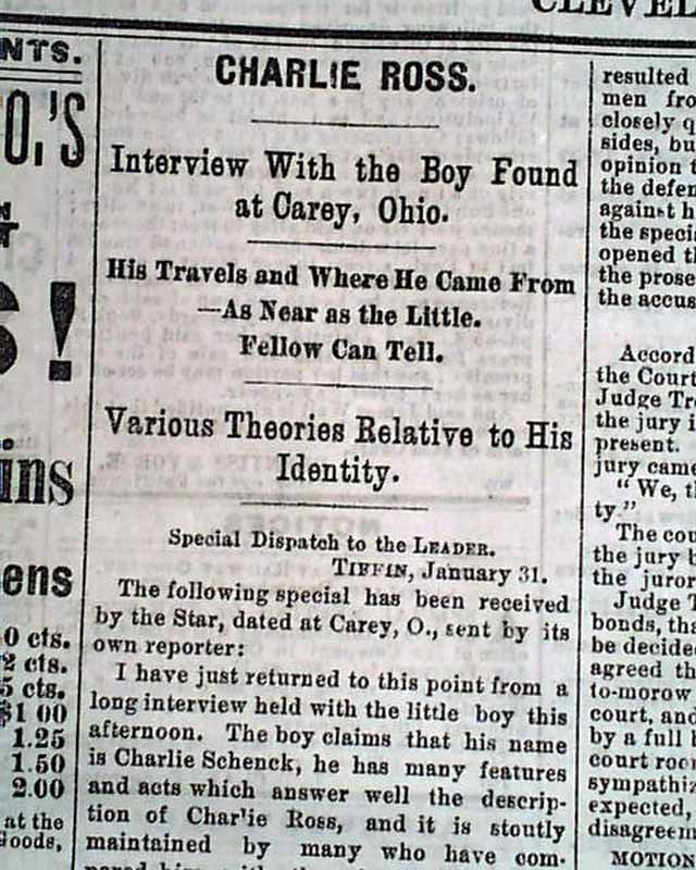 The front page has one column headings: "Charlie Ross" "Interview With the Boy Found at Carey, Ohio" "Various Theories Relative to His Identity" and more. See images for text.