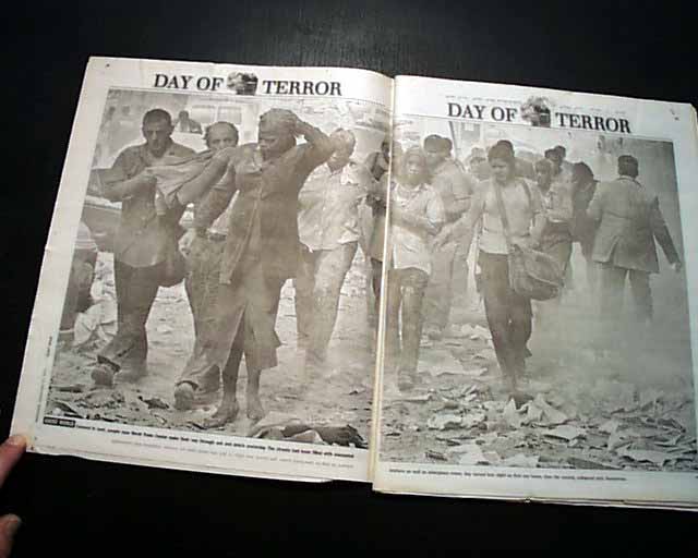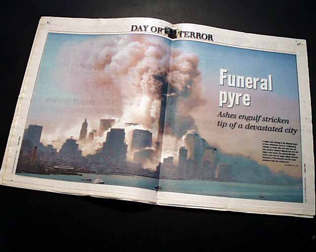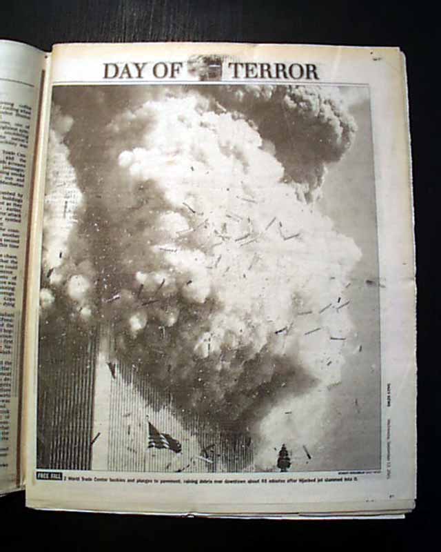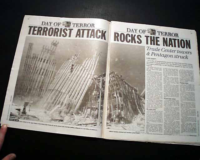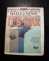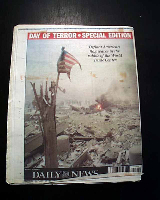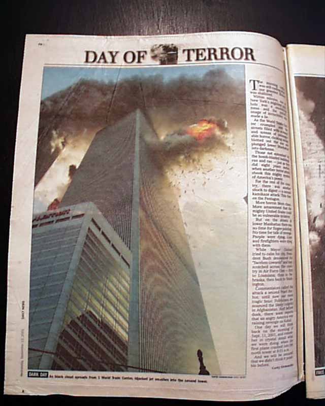 DAILY NEWS, New York, September 12, 2001 Long to be remembered as one of the most tragic events in American history, here is a New York City newspaper with coverage of the World Trade Center disaster, featuring a haunting photo on the front page of the plane about to hit the second tower. The red ink headline reads simply: "IT'S WAR". Many more photos on the inside page, this is the complete issue, tabloid-size, minor creasing, nice condition.
