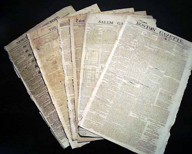 Six very early 19th century American newspapers: The Salem Gazette, April 5, 1811; Boston Gazette, March 29, 1804; The Repertory, March 18, 1807; New York Evening Post, Nov. 3, 1804; Columbian Centinel, March 24, 1804; and Independent Chronicle, June 25, 1807. All six are good "newsy" newspapers of folio size, 4 pages, some margin tears, light soiling, generally nice condition. A nice set of six different, early newspapers.