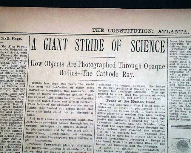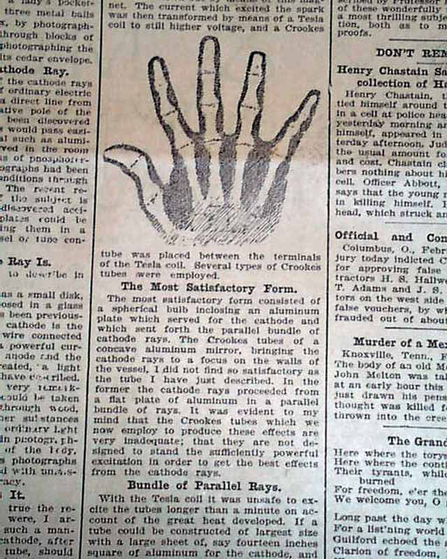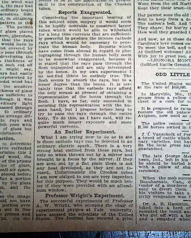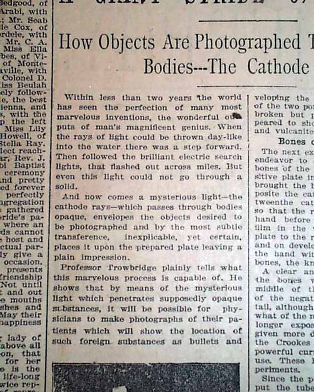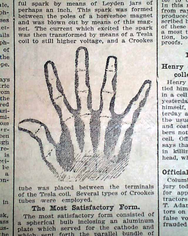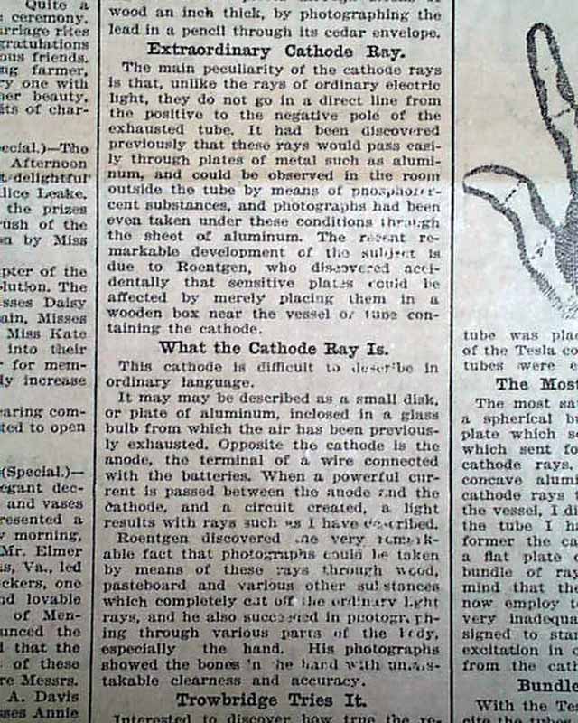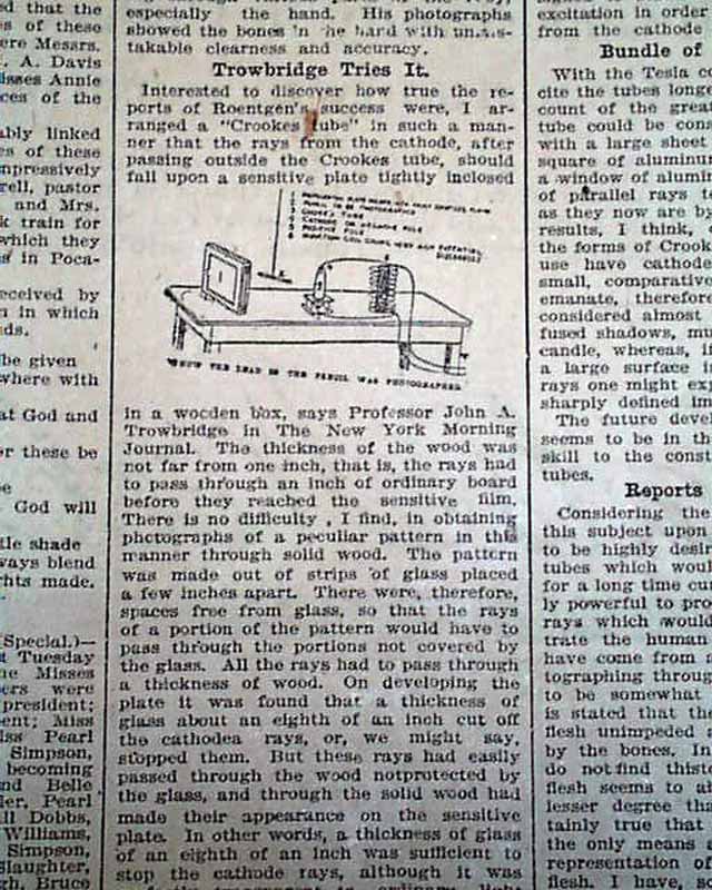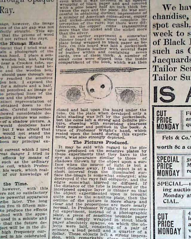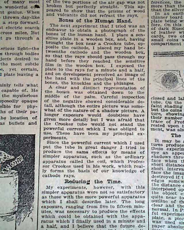 with 4 related illustrations. (see) Text takes up two columns here on the recent discovery of electromagnetic radiation in a wavelength range, more commonly called an X-ray.