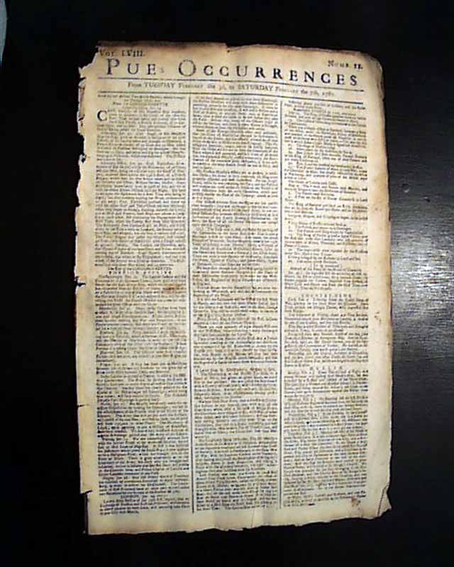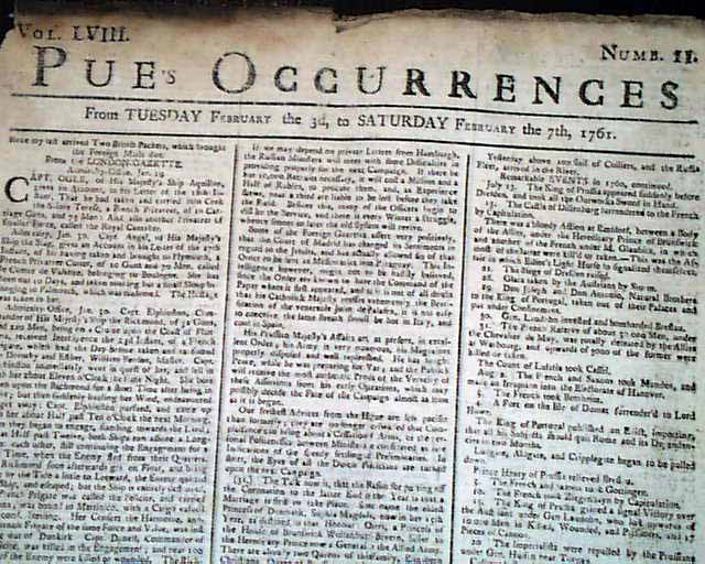 PUE'S OCCURRENCES, Dublin, Feb. 7, 1761 A rather uncommon title from London, te front page filled with reports from the London Gazette, "Foreign Affairs" "Country News" and items from Dublin. We find it difficult to come by 18th century Irish newspapers.