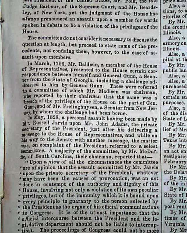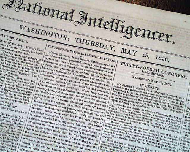 NATIONAL INTELLIGENCER, Washington, D.C., May 29, 1856  Page 3 has an item from the Senate headed: "Report On the Assault Case" which is the case of Preston Brooks beating Charles Sumner, which includes in part: "...assault him with considerable violence, striking him numerous blows on and about the head with a walking stick..." with more (see). See the hyperlink for more on this incident. Great to have this report in a newspaper from Washington, D.C.
