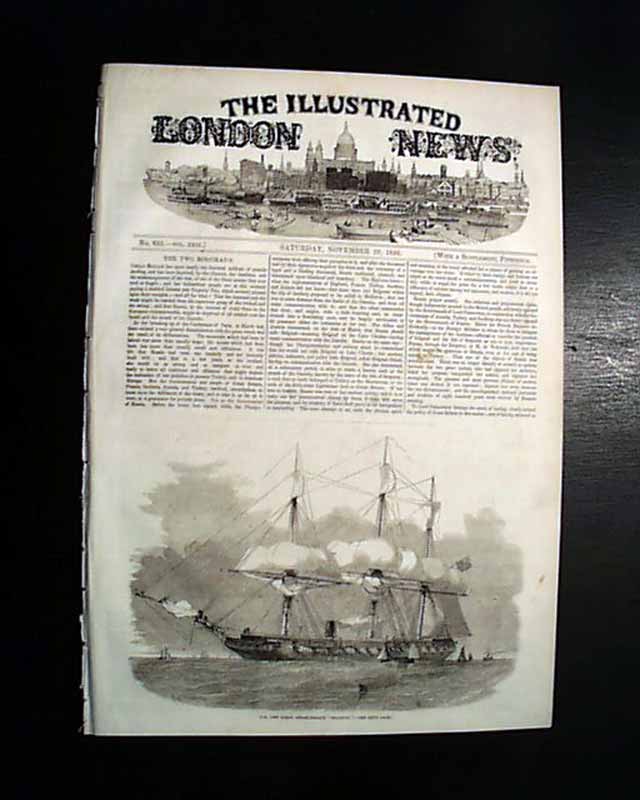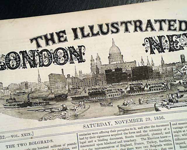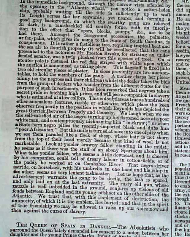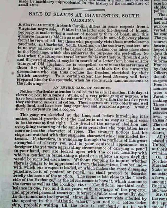 ILLUSTRATED LONDON NEWS, England, Nov. 29, 1856 See the photo for the terrific full page print captioned: "Slave Sale, Charleston, South Carolina..." with the print showing the sale of over a dozen slaves. Almost never are such large prints of slave sales found in period newspapers, and this is perhaps the very best to be found. No American newspaper printed a slave auction print which rivals this one. The image measures about 9 1/2 by 14 inches, while the entire page is 11 by 15 1/2 inches. There is also a related article on the following page.