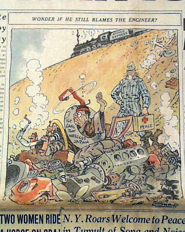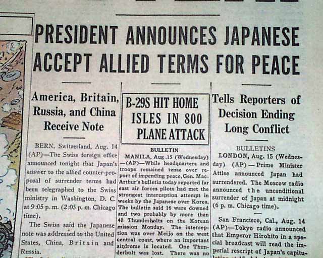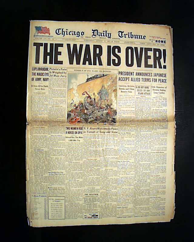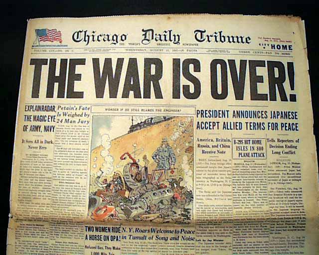 CHICAGO DAILY TRIBUNE, August 15, 1945 Large, bold, single headline: "THE WAR IS OVER ! " with subhead "President Announces Japanese Accept Allied Terms For Peace". Other articles "B-29s Hit Home Isles In 800 Plane Attack"; "Explain Radar, The Magic Eye of Army, Navy"; "N.Y. Roars Welcome to Peace in Tumult of Song and Noise" and others. There is also a color (unusual) cartoon relating to the end of the war (see).