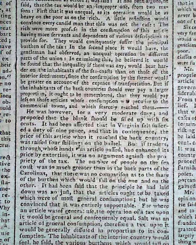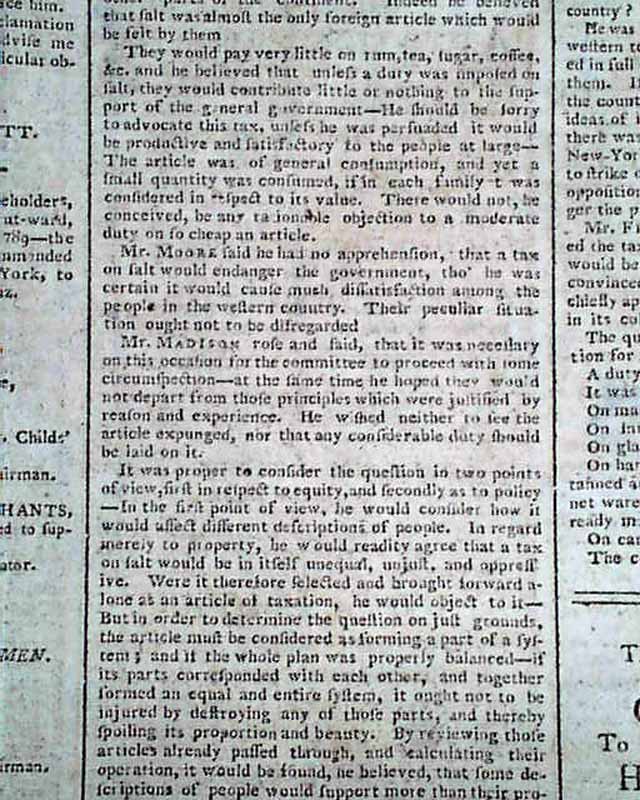 Page 2 has a brief & inconspicuous item: "We are informed that his Excellency the Vice President is now on his way from Boston to this city and may assuredly be expected on Monday next." This is followed by reporting of discussions from the earliest days of the federal congress, one bit including: "...that the salt tax would be odious--he supposed that all taxes were odious, & that people in general were not well pleased with paying any duties whatever..." with much more.