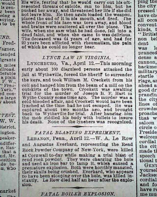 The front page has a small one column heading: "Lynch Law In Virginia" See image for brief text here. Nice to have in this venerable newspaper title.