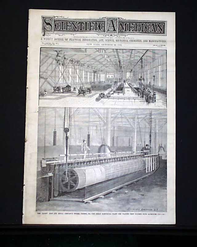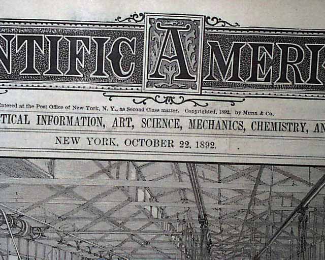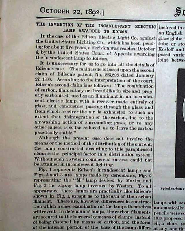 SCIENTIFIC AMERICAN, New York, Oct. 22, 1892  This issue contains a great full page article with 6 related illustrations, headed: "The Invention Of the Incandescent Electric Lamp Awarded to Edison". A great, displayable item on Edison and his famous light bulb. Also within the issue is: "The Tacony Iron and Metal Company's Works, Tacony, PA"; "The Principle Ventilating Water Closet"; "Battey's Aerial Ship" and more.