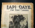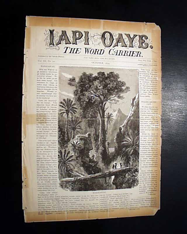 This very uncommon newspaper was founded in 1871 with pages 1, 2 & 3 in the Dakota Indian language, and the last page in English. In 1884 the editor decided to divide & separately publish the Dakota and English language material, titled separately "Iapi Oaye" and "Word Carrier". This issue precedes that event and carries both names in the masthead (see).