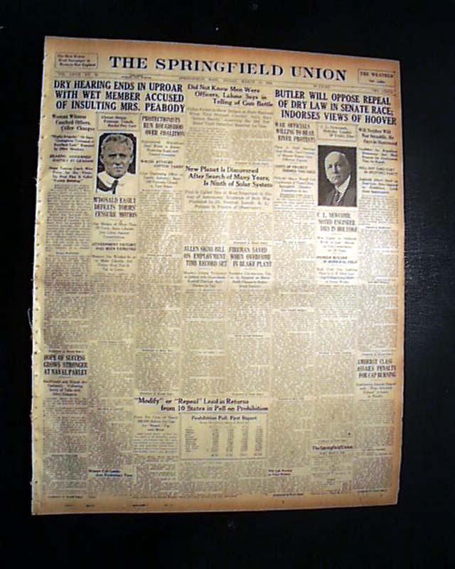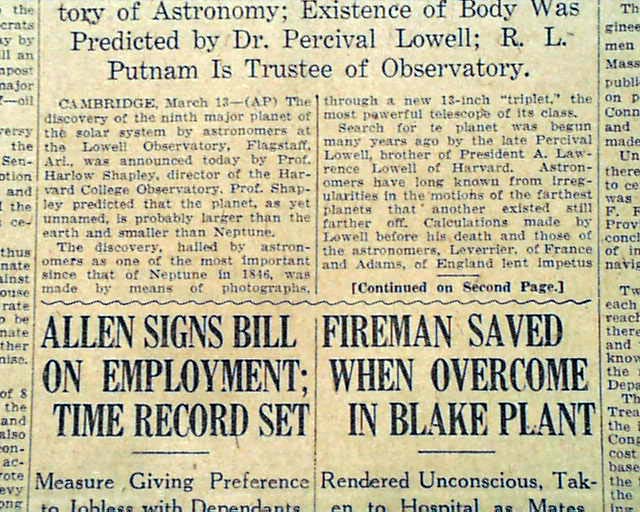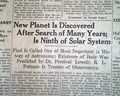 The front page has two column headlines that include: "New Planet Is Discovered After Search of Many Years; Is Ninth of Solar System" and more (see photos).