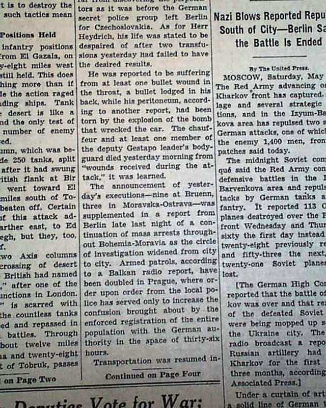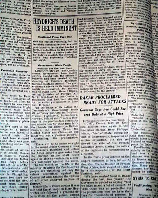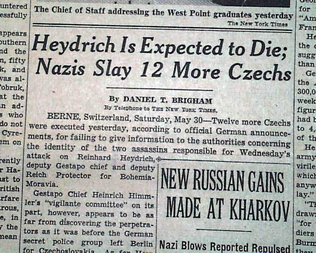 This 30 page newspaper has a two column headline on the front page: "Heydrich Is Expected to Die; Nazis Slay 12 More Czechs" Coverage on the recent attack on SS leader, Reinhard Heydrich. he would die a few days later.