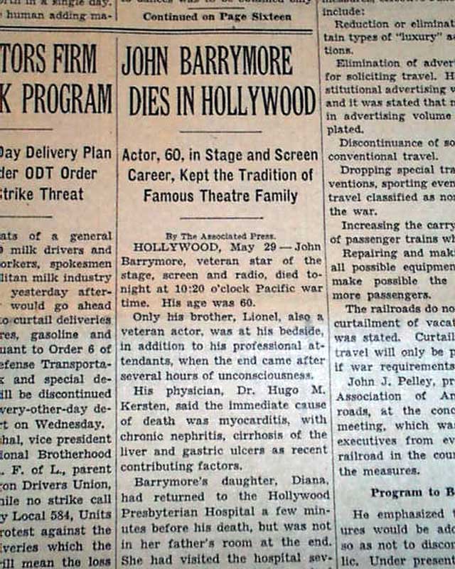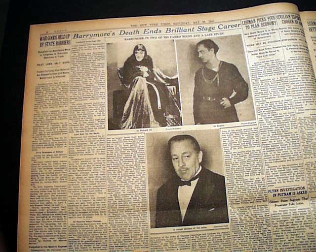 Also one column headlines on the front page: "John Barrymore Dies In Hollywood" "Actor, 60, in Stage and Screen Career, kept the Tradition of Famous Theatre Family'