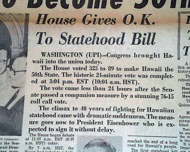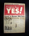 See the photo for this very dramatic & displayable front page. Nearly the top half of the front page is taken up with: "Congress Says YES ! " in huge letters dropped out of a large red box, above which is printed: "2nd Statehood Extra". The banner headline beneath the box is: "Hawaii To Become 50th State" with other related subheads. One of the front page photos shows Hawaii politicians celebrating in Washington, D.C.