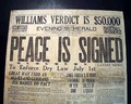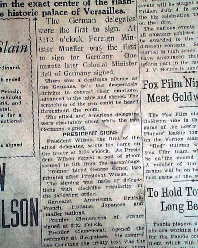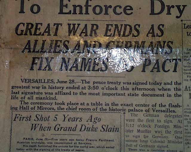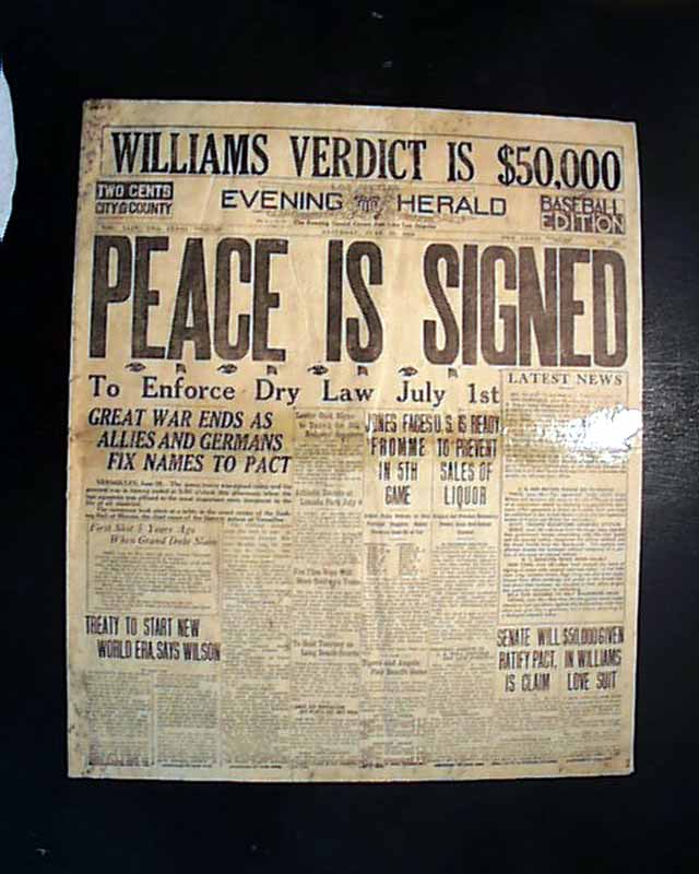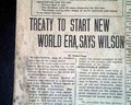 The large, bold banner headline announces: "PEACE IS SIGNED" ending World War I, with a subhead: "Great War Ends As Allies And Germans Fix Names To Pact" and "Treaty To Start New World Era, Says Wilson".