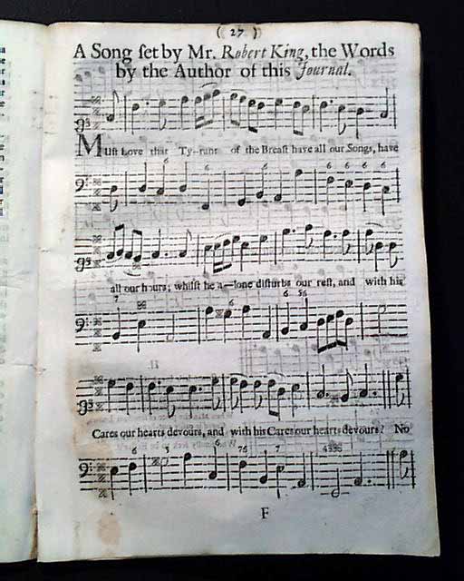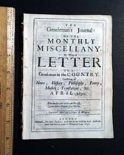 THE GENTLEMAN'S JOURNAL OR THE MONTHLY MISCELLANY, London, April, 1692 If 18th century magazines are scarce, titles from the 17th century are exceedingly rare. Here is one such title, subtitled: "To A Gentleman in the Country Consisting of News, History, Philosophy, Poetry, Musick, Translations, etc."This issue features a full titlepage, with page 2 having "The Contents" (see). The back six pages are music (see).