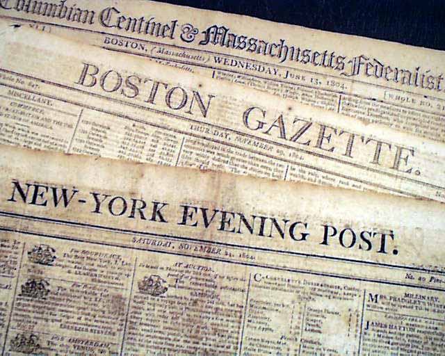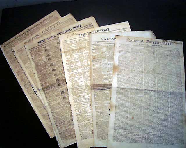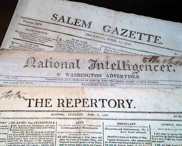 Six very early 19th century American newspapers: Boston Gazette, Nov. 29, 1804; The Salem Gazette, April 11, 1811; The Repertory, April 7, 1807; New York Evening Post, Nov. 24, 1804; Columbian Centinel, June 13, 1804; and National Intelligencer, July 6, 1808. All six are good "newsy" newspapers of folio size, 4 pages, some margin tears, generally good condition. A nice set of six different, early newspapers.