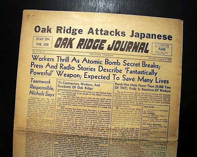 OAK RIDGE JOURNAL, Oak Ridge, Tennessee, Aug. 9, 1945 Oak Ridge was established in the early 1940's as a base for the Manhattan Project, the massive United State government operation that developed the atomic bomb. In the efforts of serious collectors to own newspapers from as close to "where it happens" as possible, this could well be the best newspaper concerning the atomic bomb outside of a Japanese newspaper.