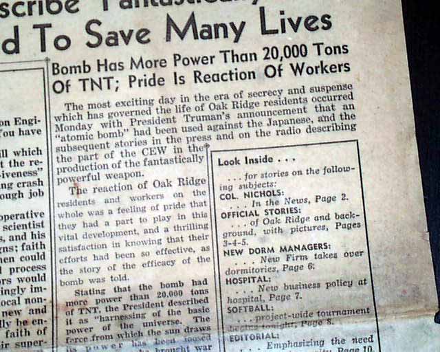 Note the banner headline above the masthead: "Oak Ridge Attacks Japanese", which would not be found in any other newspapers. The tone of the remainder of the front page is great pride in the efforts of the employees of Oak Ridge, with the 3 line banner headline reading: "Workers Thrill As Atomic Bomb Secret Breaks; Press And Radio Stories Describe 'Fantastically Powerful' Weapon; Expected To Save Many Lives", with a subhead; "Bomb Has More Power Than 20,000 Tons of TNT; Price is Reaction Of Workers". Included is a lengthy letter to the contractors & workers of Oak Ridge congratulating them on their: "...hard work & American 'stick-to-it-iveness'...delivered to the Japs with a world-shaking crash--the thrill that comes with the knowledge of a tough job well done...". Related articles and photos inside.