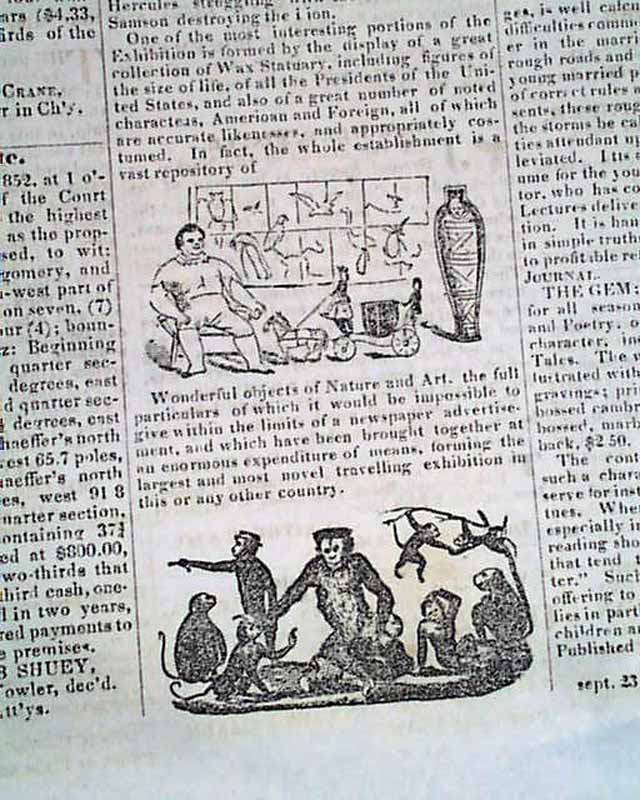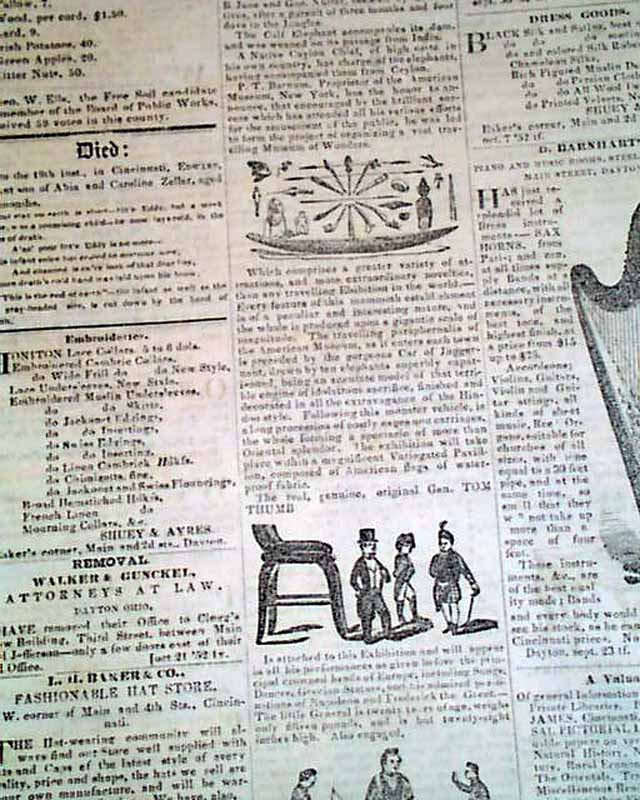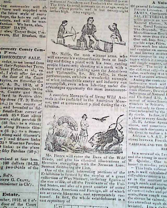 Page 3 features a full column illustrated advertisement for: "P. T. Barnum's Grand Colossal Museum and Menagerie" which includes 7 engravings including one showing Tom Thumb (see).