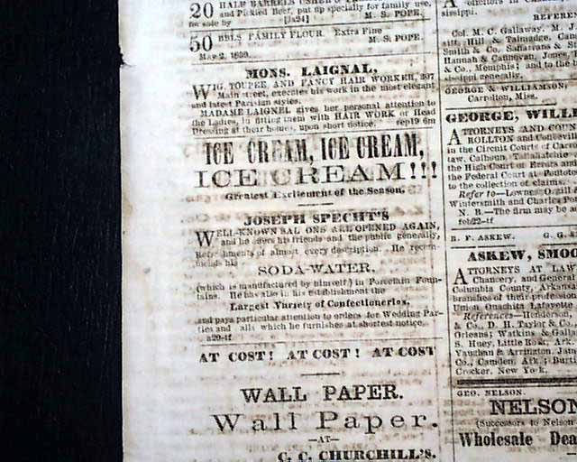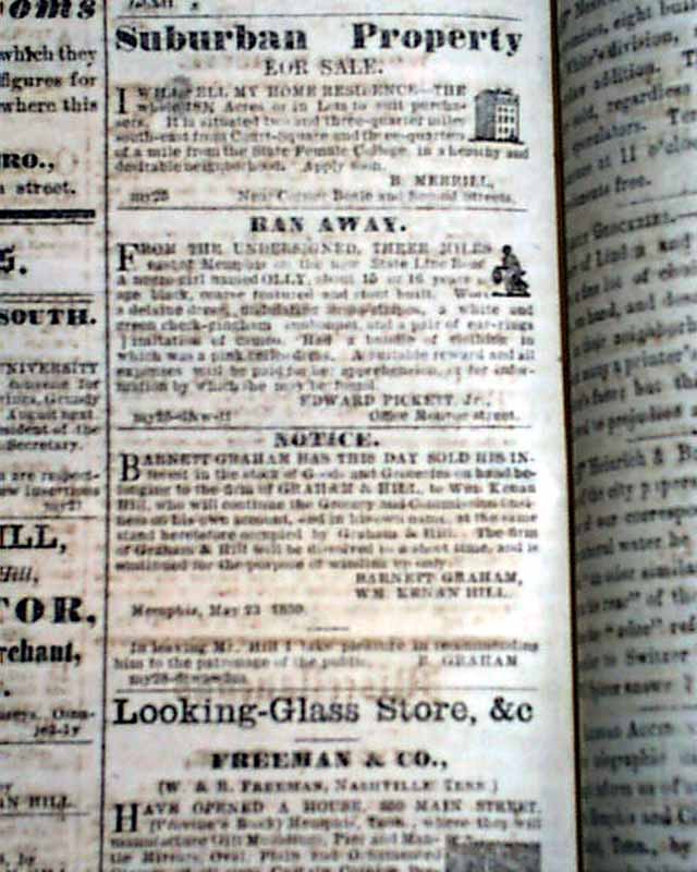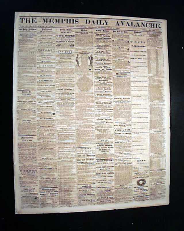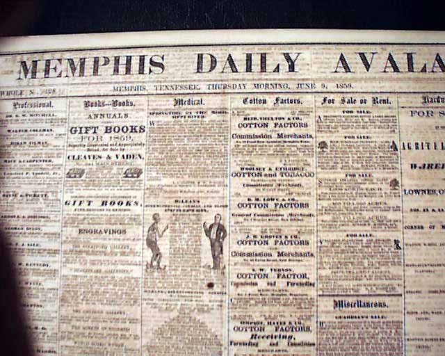 THE MEMPHIS DAILY AVALANCHE, Tennessee, June 9, 1859 From not long before the Civil War containing on the front page two illustrated ads for slaves for sale, with details, and another illus. slave ad inside.