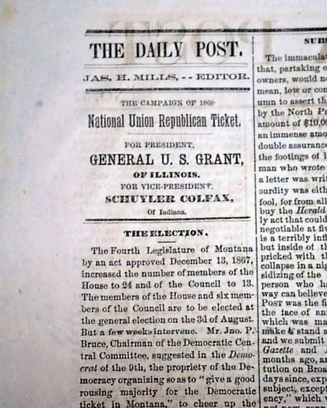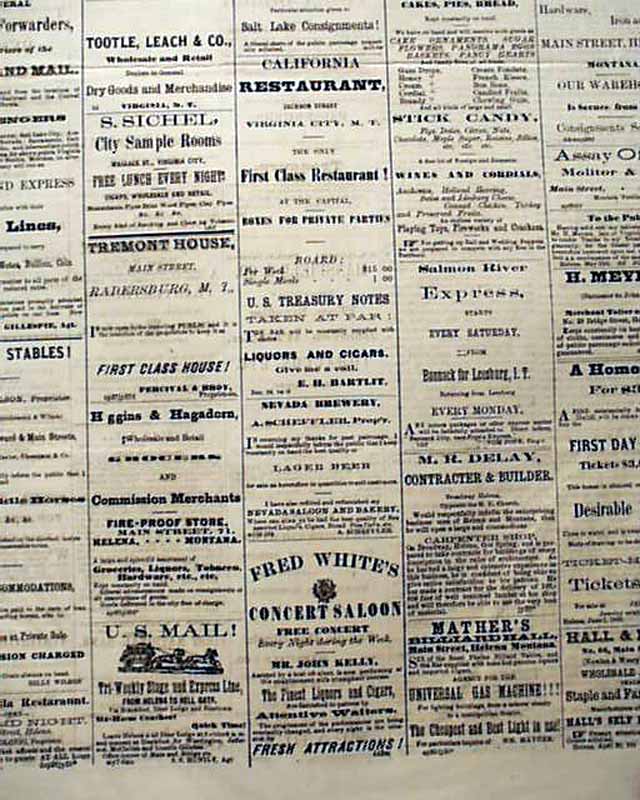 A very rare newspaper and a terrific issue for any collection of the Old West. The very first newspaper in the Montana Territory was the Montana Post which began in 1864 in Virginia City. In 1868 the newspaper was moved to Helena and the volume numbering began again, so this is an early volume one issue (#52). Montana did not become a state until 1889.