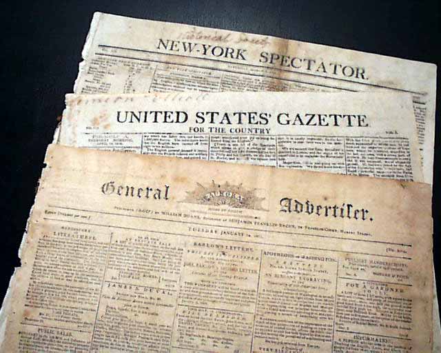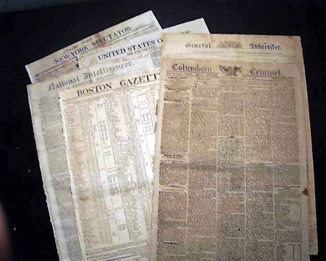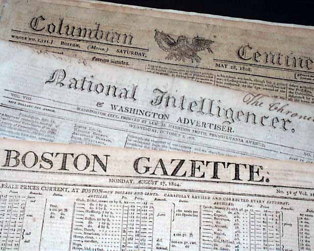 Six very early 19th century American newspapers: Boston Gazette, Aug. 27, 1804; Aurora General Advertiser, Jan. 20, 1801; New York Spectator, March 9, 1811; United States Gazette, April 13, 1809; Columbian Centinel, May 28, 1808; and National Intelligencer, Oct. 5, 1808. All six are good "newsy" newspapers of folio size, 4 pages, some margin tears, generally good condition. A nice set of six different, early newspapers.
