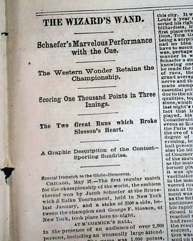 This uncommon Midwestern title has news of the day with many advertisements. Page 5 has an article headed: "THE WIZARD'S WAND" "Schaefer's Marvelous Performance with the cue" "The Western Wonder Retains the Championship" and more. (see) Text takes up over a full column.