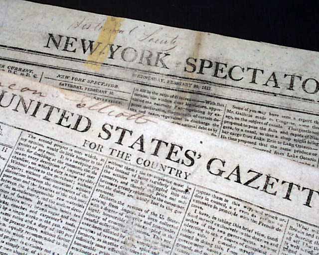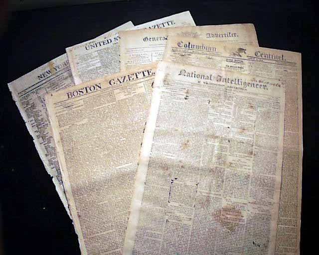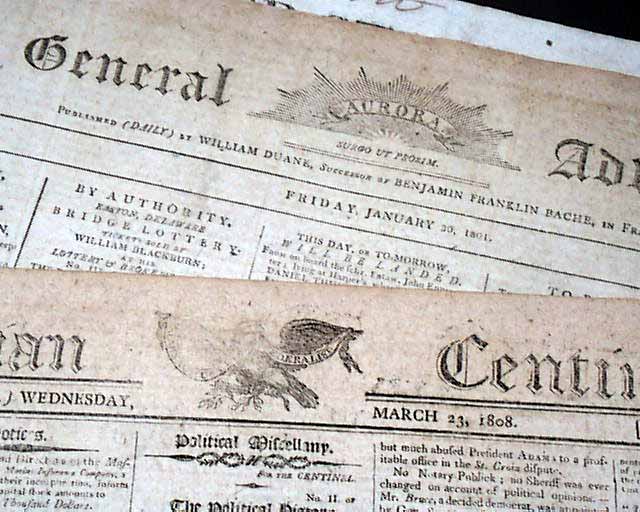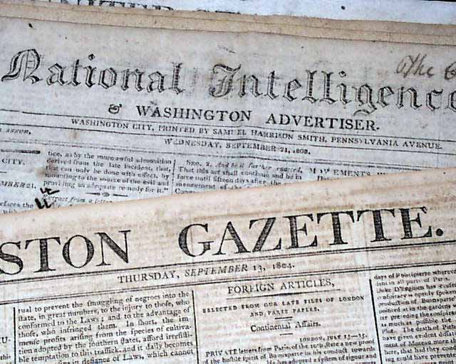 Six very early 19th century American newspapers: Boston Gazette, Sept. 13, 1804; National Intelligencer, Sept. 21, 1808; Columbian Centinel, March 23, 1808; Aurora General Advertiser, Jan. 30, 1801; United States Gazette, March 27, 1809; and New York Spectator, Feb. 20, 1811. All six are good "newsy" newspapers of folio size, 4 pages, some margin tears, generally good condition. A nice set of six different, early newspapers.