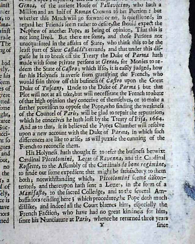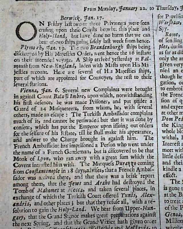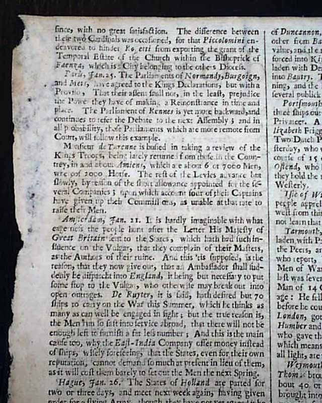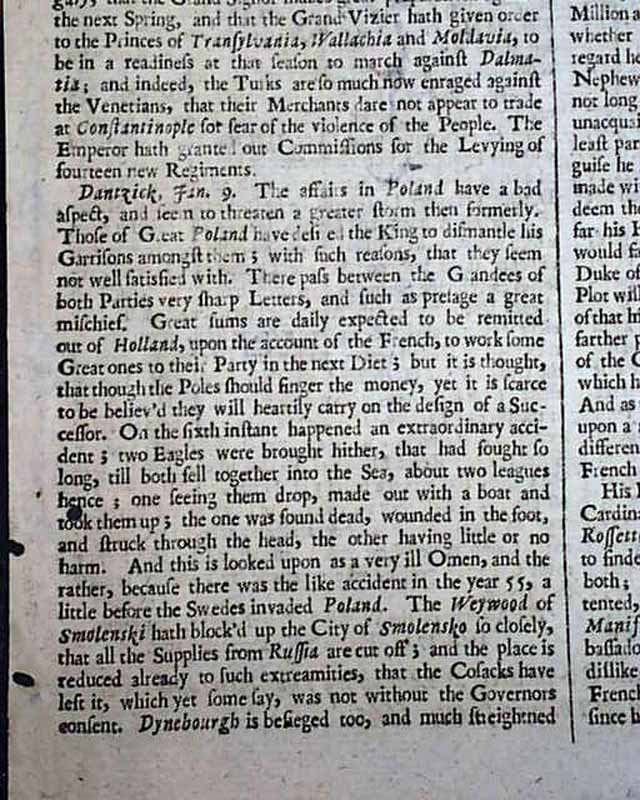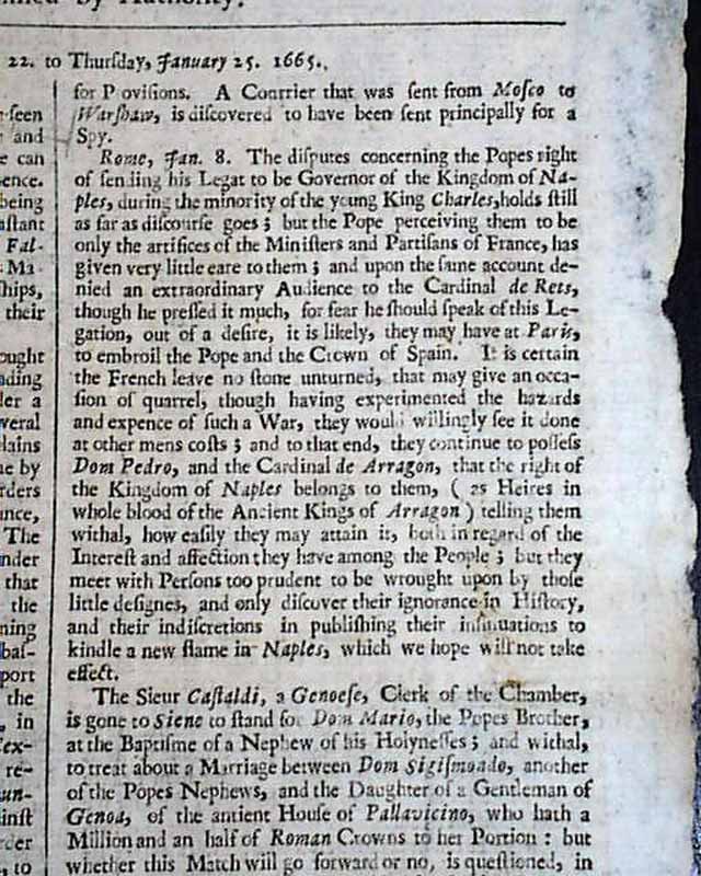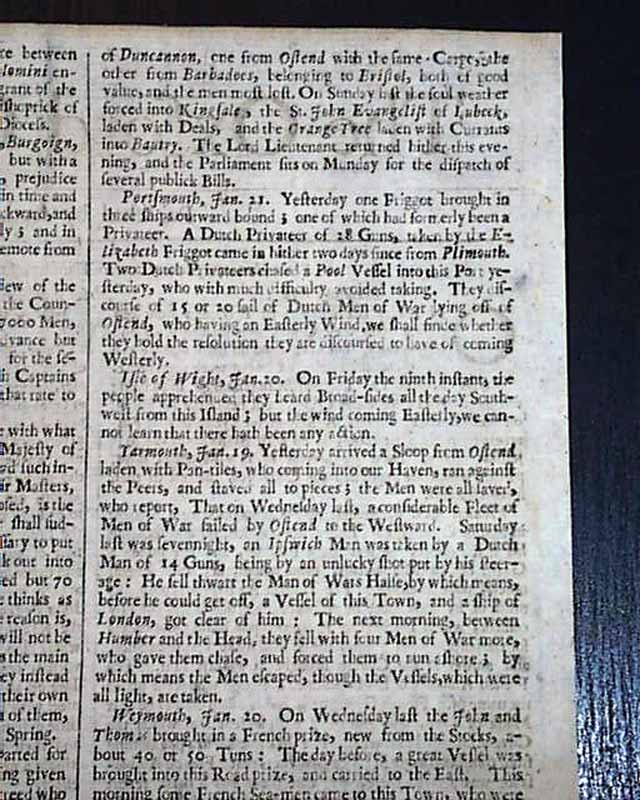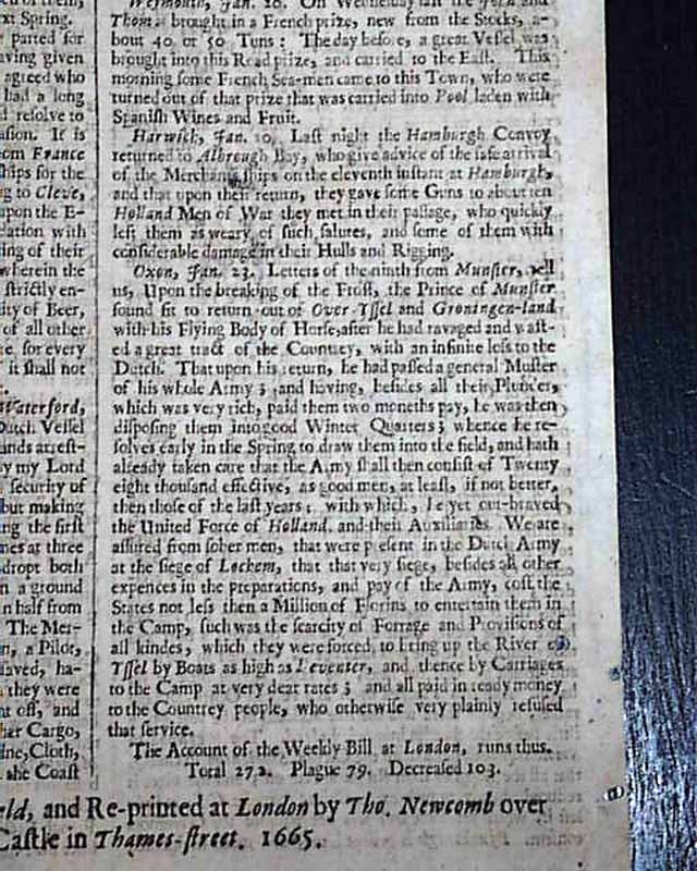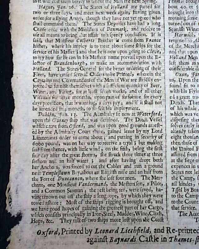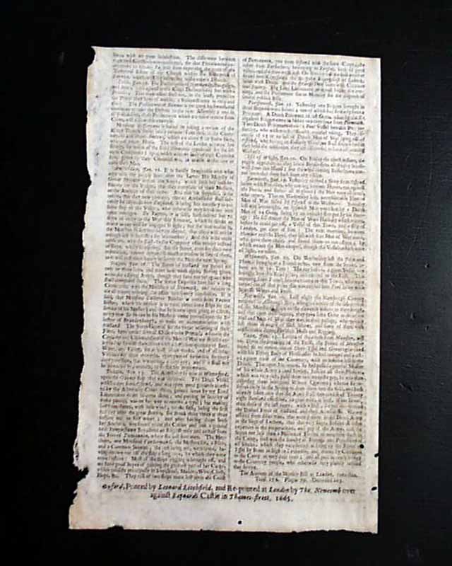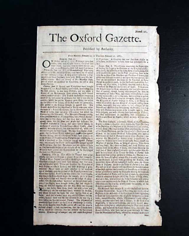 THE OXFORD GAZETTE, England, January 25, 1665 (1666 by today's calendar) - issue #21 This is an extremely famous--and rare--title, being the predecessor of the famous "London Gazette", the oldest continually published English language newspaper in the world. Because of the Plague at this time, the Royal Court had removed itself from London to Oxford when this newspaper began, so issues #1 thru #23 were published in Oxford (actually published simultaneously in London & Oxford), and when the contagion had subsided & the Court returned to London this newspaper went with it and renamed itself "The London Gazette" with issue #24, and the rest is history. This is issue number 21.