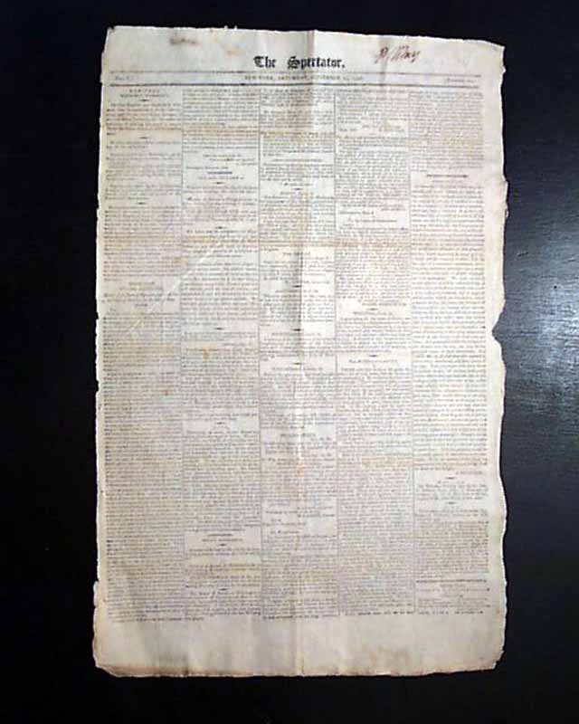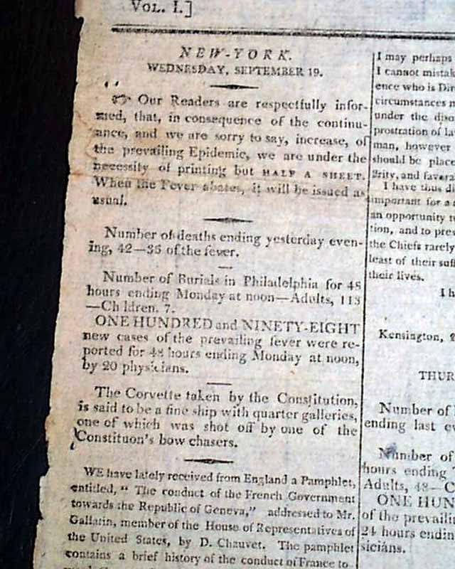 An unusual issue being single sheet rather than the typical 4 pages, explained at the top of the first column: "Our readers are respectfully informed that, in consequence of the continuance, and we are sorry to say, increase, of the prevailing Epidemic, we are under the necessity of printing but half a sheet. When the fever abates, it will be issued as usual." This is concerning the Yellow Fever Epidemic which ravaged much of the Eastern United States at that time. There are many front page articles relating to the epidemic as well.