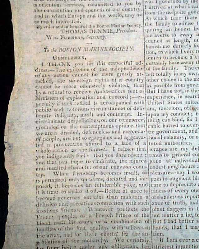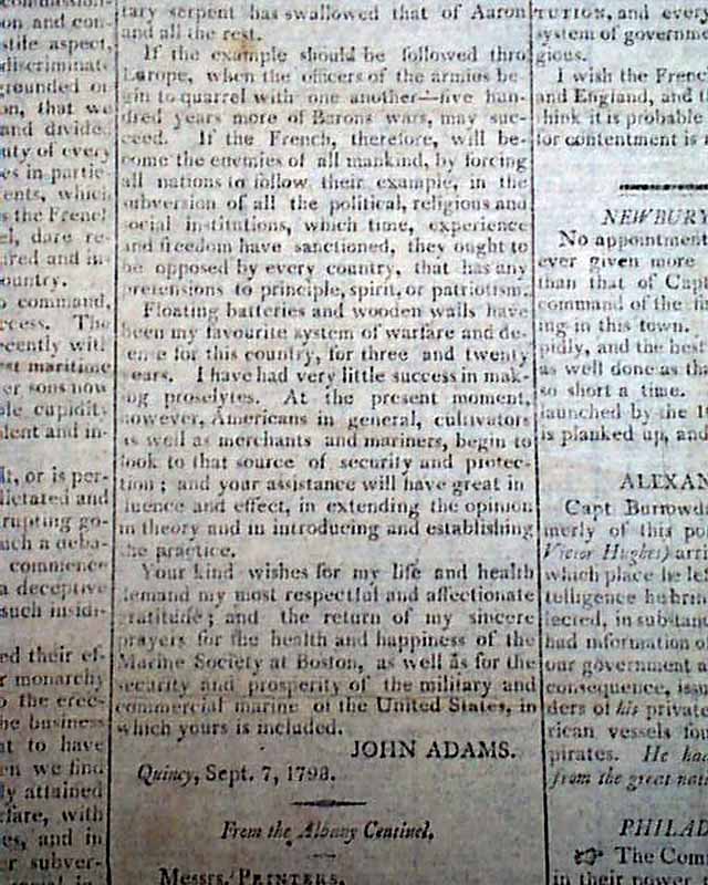 The back page has a letter on response to: "The Boston Marine Society" signed in type by the President: John Adams.