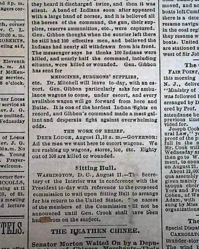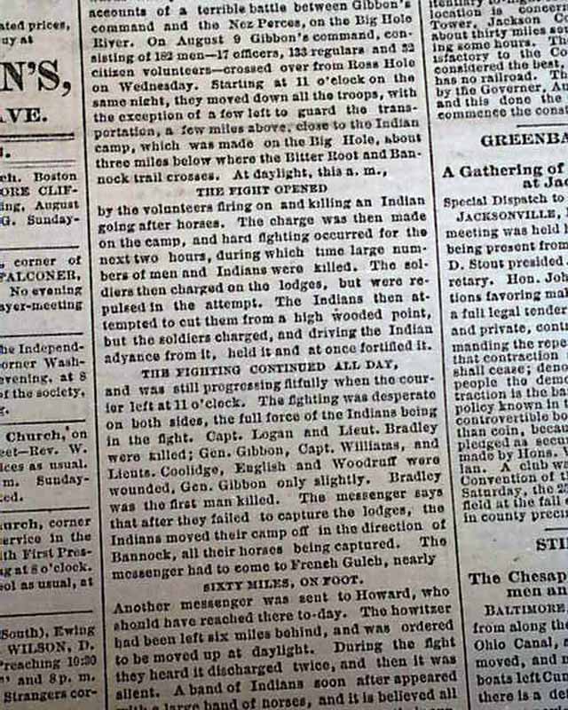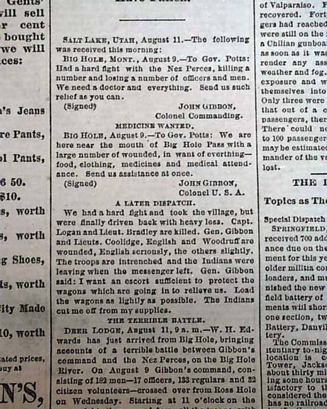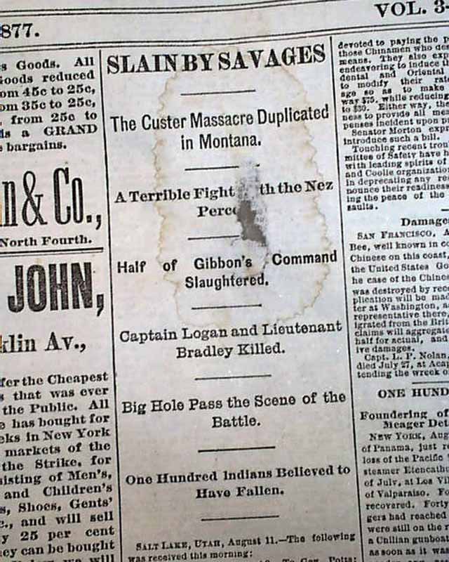 This uncommon Midwestern title has news of the day with many advertisements. The front page has an article headed: "SLAIN BY SAVAGES" "The Custer Massacre Duplicated in Montana" "A Terrible Fight with the Nez Perces" "Half of Gibbon's Command Slaughered" "Big Hole Pass the Scene of the Battle" and more. (see)