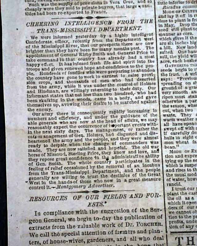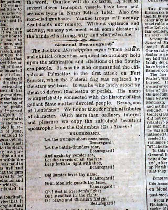 Among the front page reports are: "Cheering Intelligence from the Trans-Mississippi Dept." "Strike While the Iron is Hot" "General Beauregard"" which includes a poem to him (see); "The Outrages of Rosecrans in Tennessee" "and a few other items.