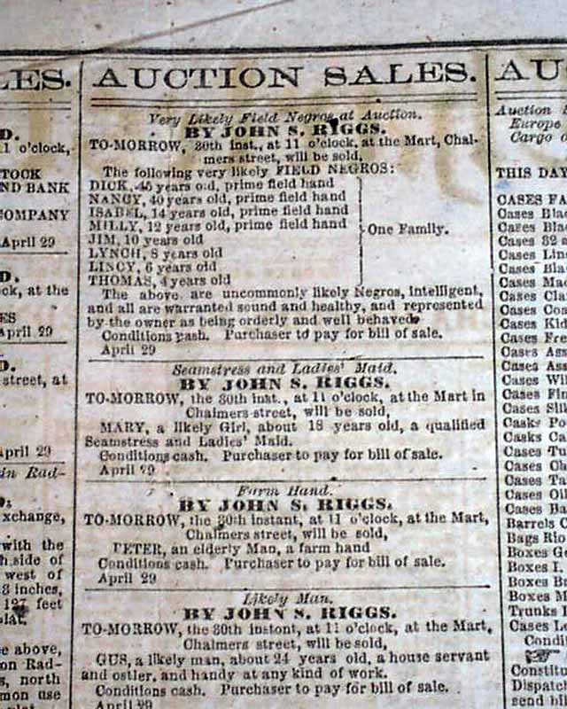 The back page includes a string of 7 slave sale ads each with details (see). Single sheet, very nice condition.