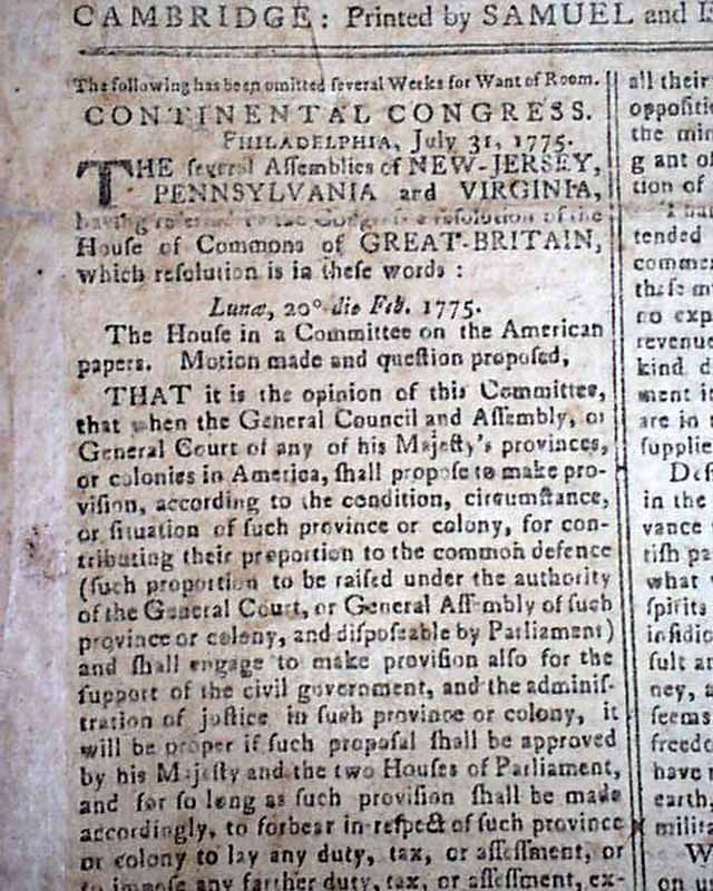 A very historic issue as the front page contains not only the full text of the Conciliatory Resolution by Parliament, but the Continental Congress' lengthy response to it, signed in type by its President: John Hancock.