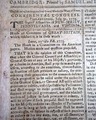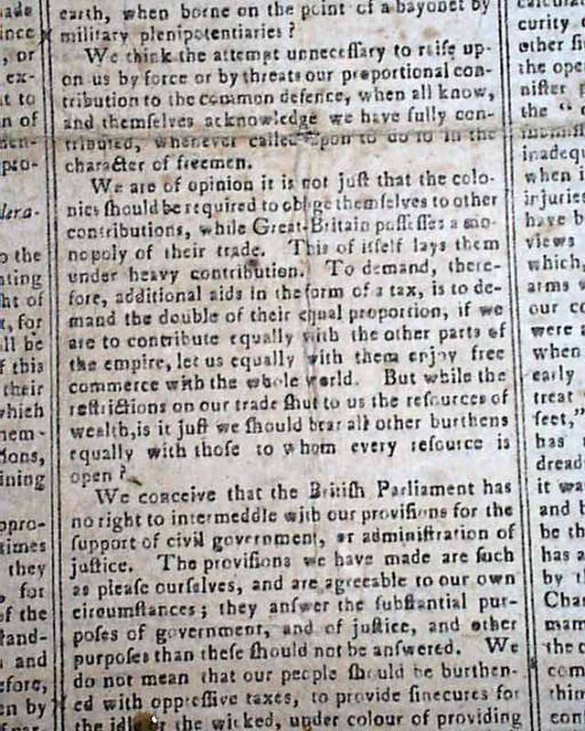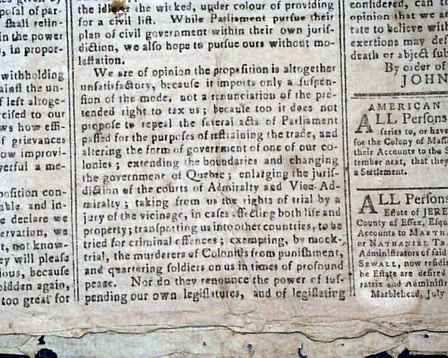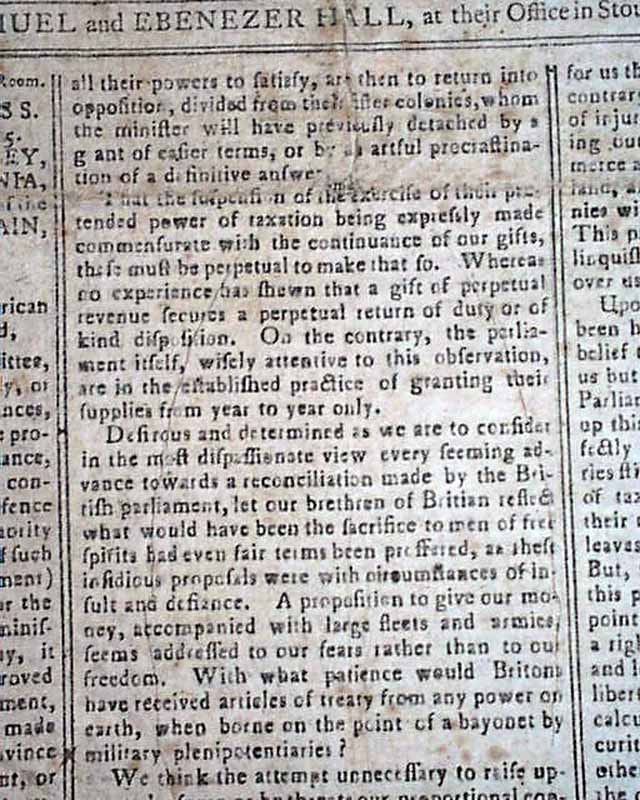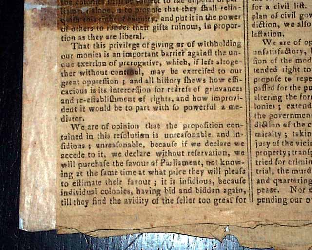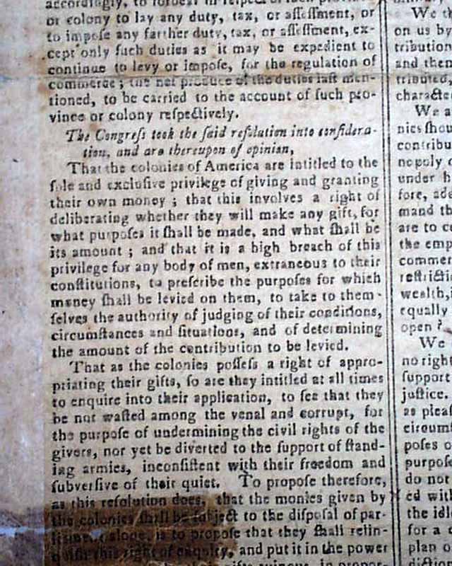 The Conciliatory Resolution was a resolution passed by the British Parliament in an attempt to reach a peaceful settlement with the thirteen colonies immediately prior to the outbreak of the American Revolutionary War. But it proved to be too little, too late. Congress responded to it, with the full text contained on the front page of this issue, one portion noting: "The Congress took the said resolution into consideration, and are, thereupon, of opinion, that colonies of America are entitled to the sole and exclusive privilege of giving and granting their own money....To propose, therefore...that the monies given by the colonies shall be subject to the disposal of parliament alone, is to propose that they shall relinquish this right of enquiry, and put it in the power of others to render their gifts ruinous....The proposition seems also to have been calculated more particularly to lull into fatal security our well-affected fellow-subjects on the other side the water, till time should be given for the operation of those arms, which a British minister pronounced would instantaneously reduce the "cowardly" sons of America to unreserved submission..." and so much more (see).