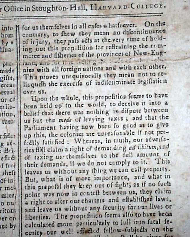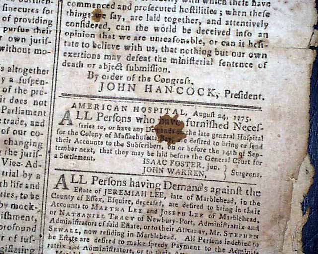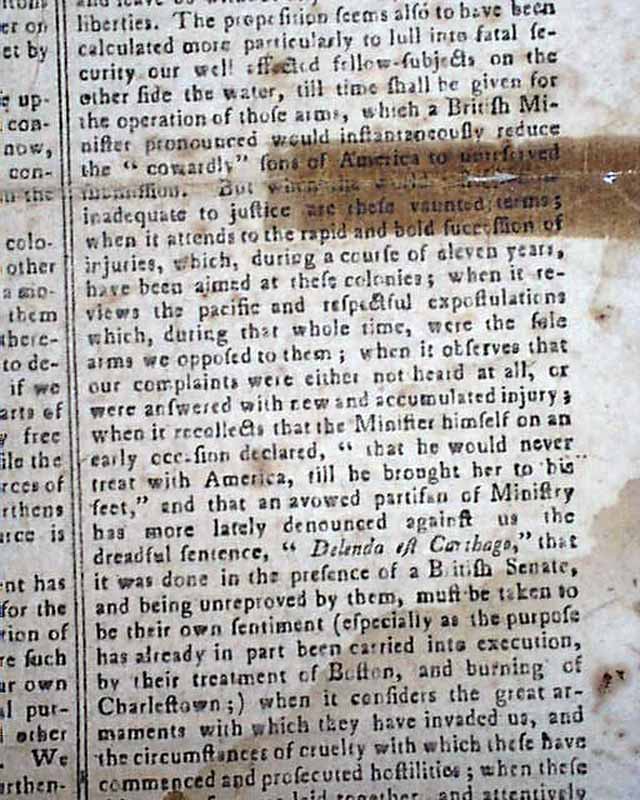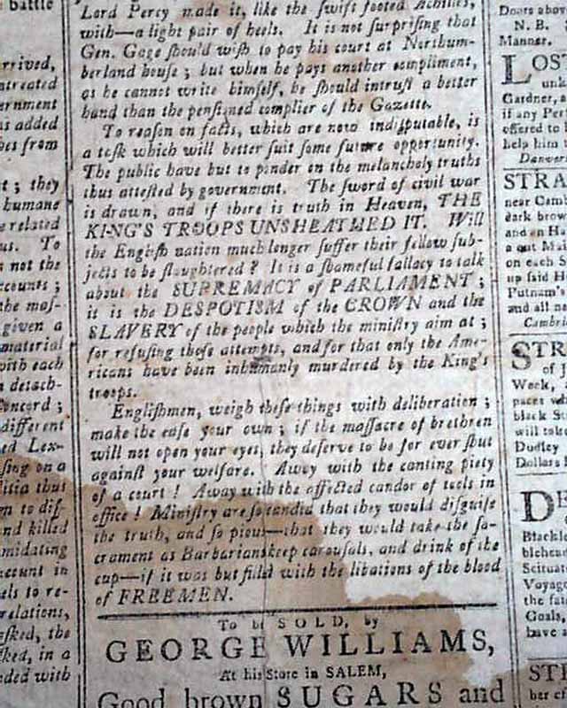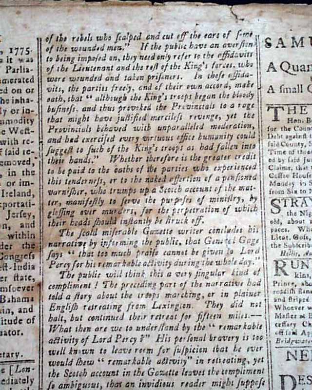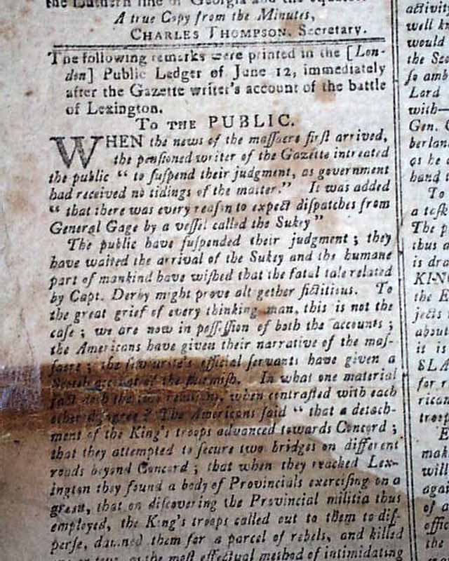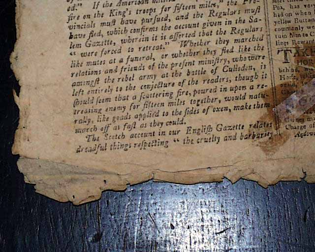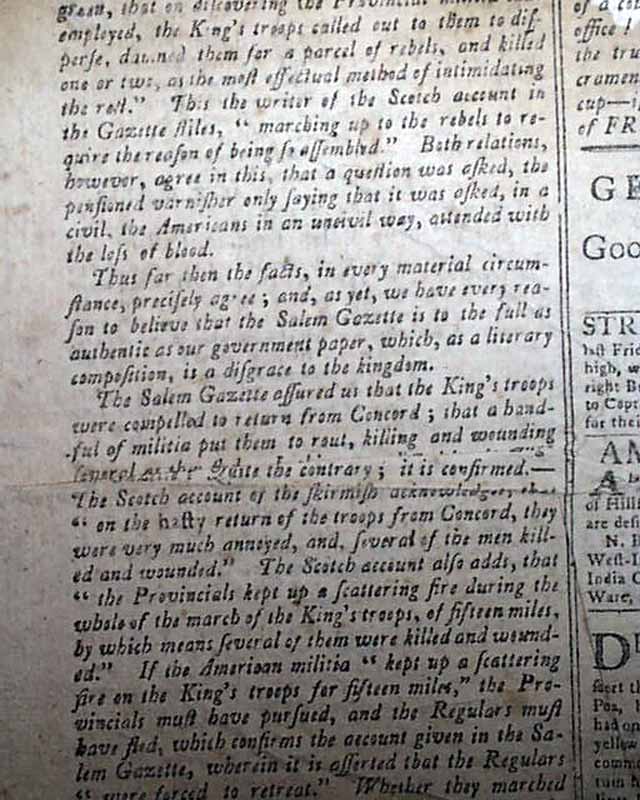 There is war-related content on the inside pages, including a nice back page letter concerning the Battle of Lexington & Concord, but all this pales in comparison to to historic front page reports.