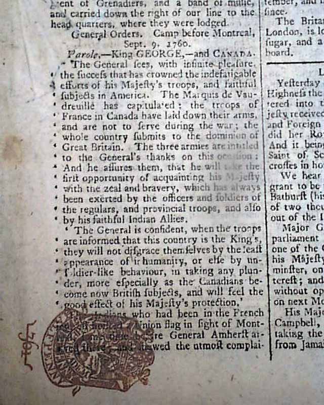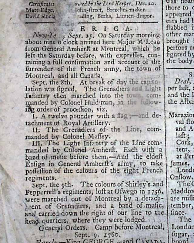 Page 2 has nearly a full column, historic report concerning the capitulation of Montreal to the British under the heading: "America". It includes: "...arrived here Major M'Lean from General Amherst at Montreal...with expresses containing a full confirmation & account of the surrender of the French army, the town of Montreal, and all Canada. At break of day the capitulation was signed..." with an order of the soldiers formally marching into town (see). Included also is a formal "General Orders" document from the "camp before Montreal, Sept. 9, 1760" which includes: "The General sees, with infinite pleasure, the success that has crowned the indefatigable efforts of his Majesty's troops & faithful subjects in America. The Marquis de Vaudreille has capitulated; the troops of France in Canada have laid down their arms...the whole country submits to the dominion of Great Britain..." with more (see).