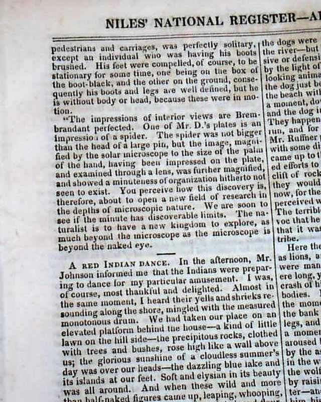 Certainly the prime content in this issue is the very historic and extremely early report on the invention of photography, headed: "The Daguerrotipe". The text takes over half a column and begins: "You have perhaps heard of the Daguerrotipe,so called from the discoverer, M. Daguerre. It is one of the most beautiful discoveries of the age..." with much, much more on this historic invention (see photos for full text).