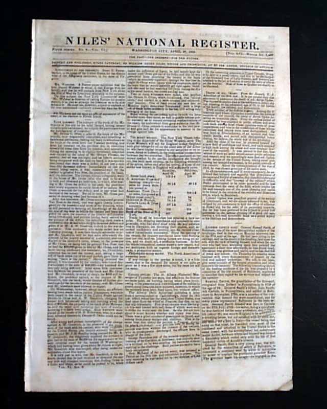 This newspaper began in 1811 and was a prime source for national political news of the first half of the 19th century. As noted in Wikipedia: "Niles edited and published the Weekly Register until 1836, making it into one of the most widely-circulated magazines in the United States and himself into one of the most influential journalists of his day. Devoted primarily to politics, Niles' Weekly Register is considered an important source for the history of the period."