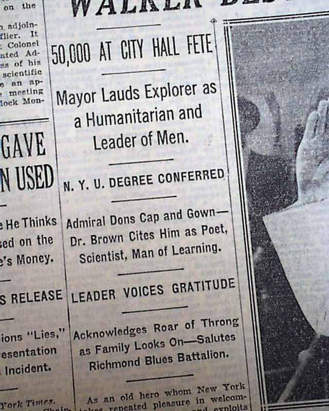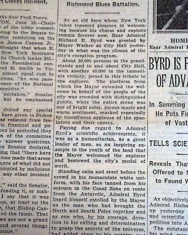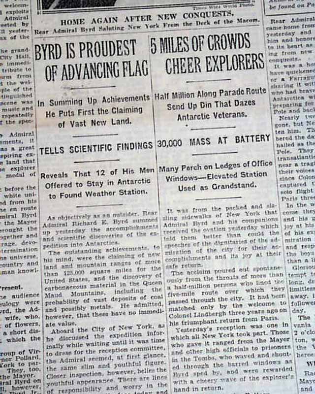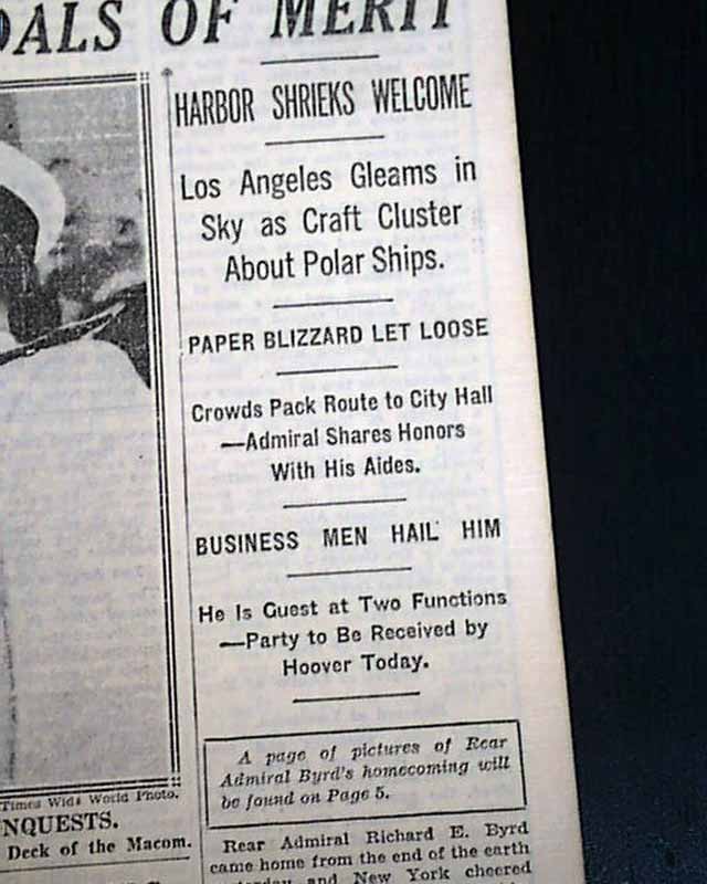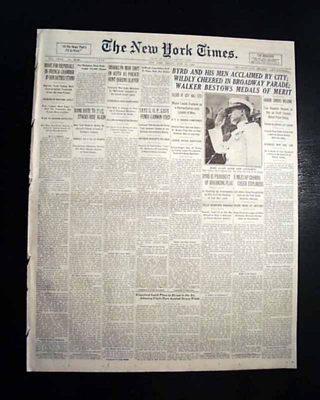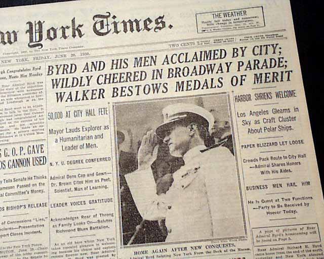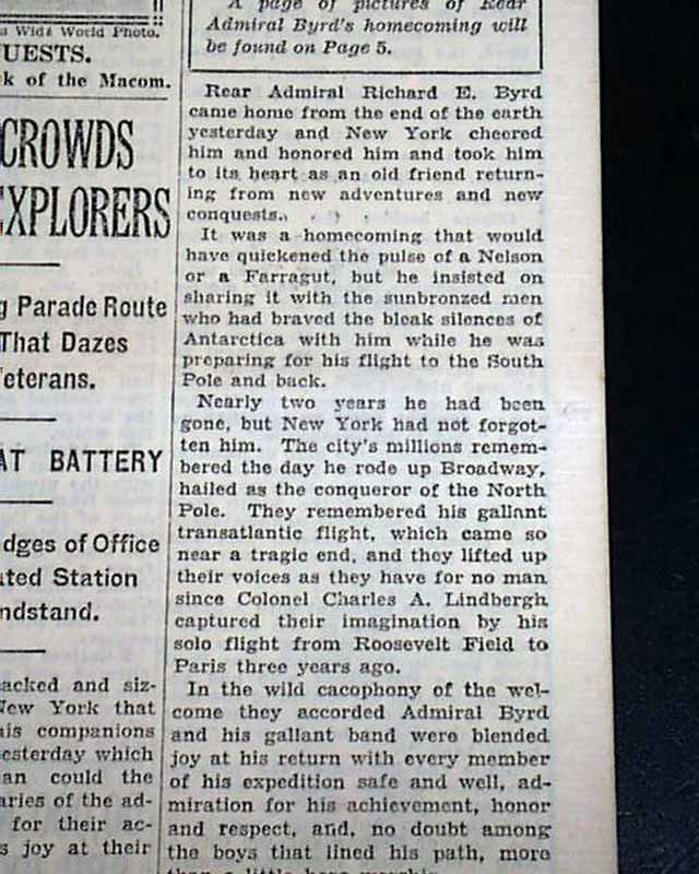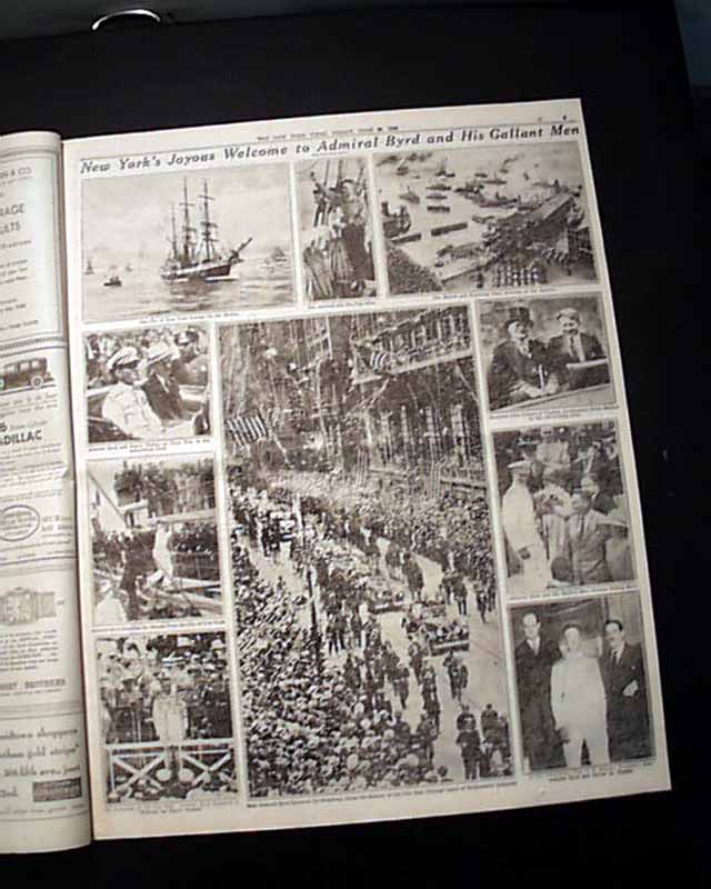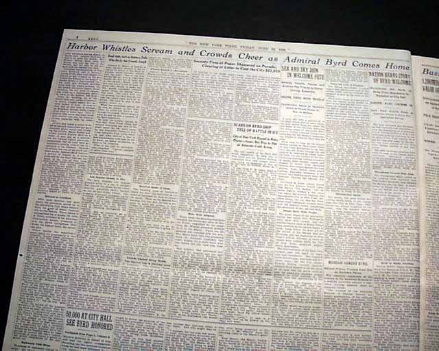 The front page has a four column headline: "BYRD AND HIS MEN ACCLAIMED BY CITY; WILDLY CHEERED IN BROADWAY PARADE; WALKER BESTOWS MEDALS OF MERIT" with many subheads and photo of Richard E. Byrd. Much more on the inside pages with great full page pictorial. Loads of text. Great to have in this famous NYC title.